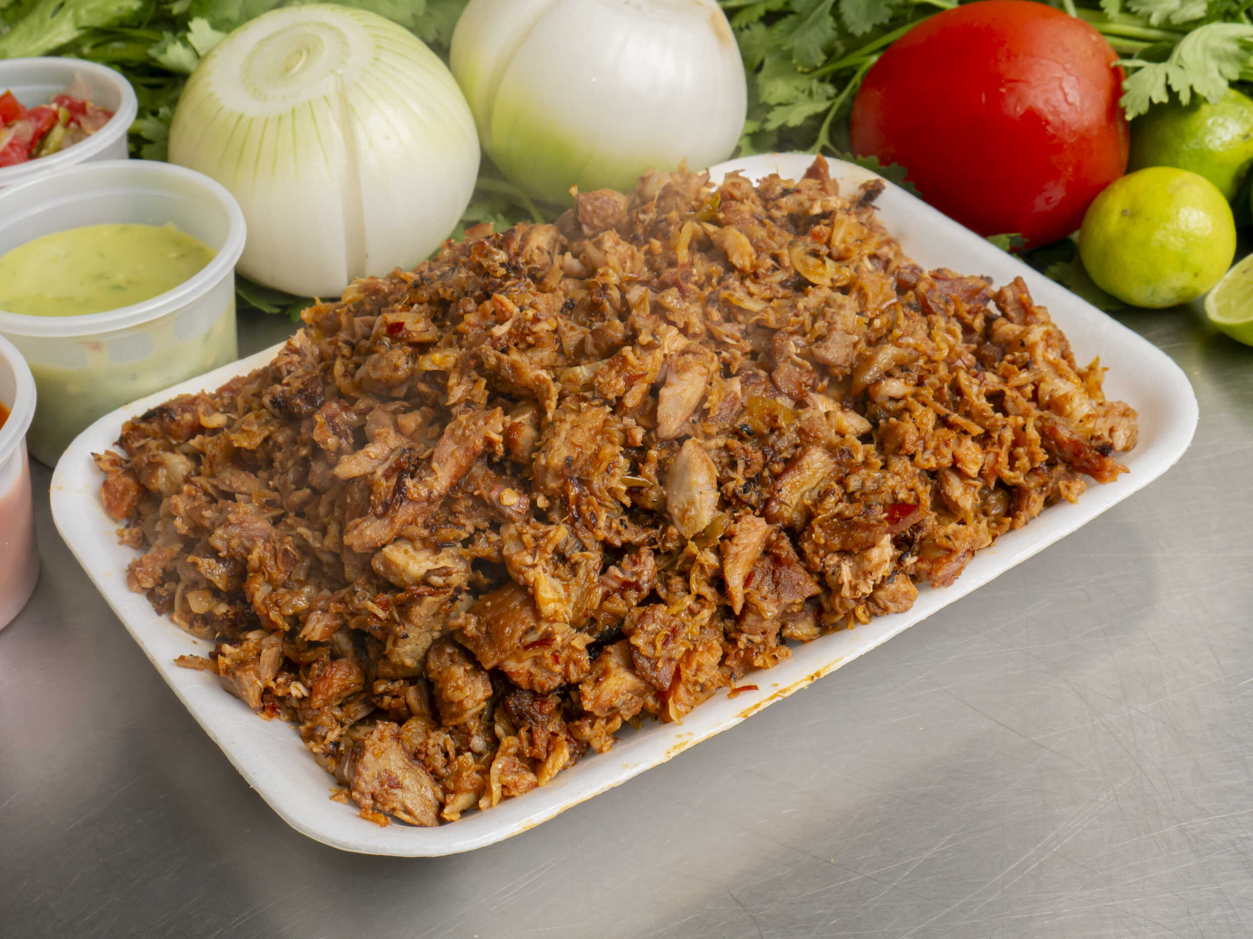 1/2 kg. De pastor. Acompañado de tortillas de maíz, cebolla, cilantro, limones y salsa.