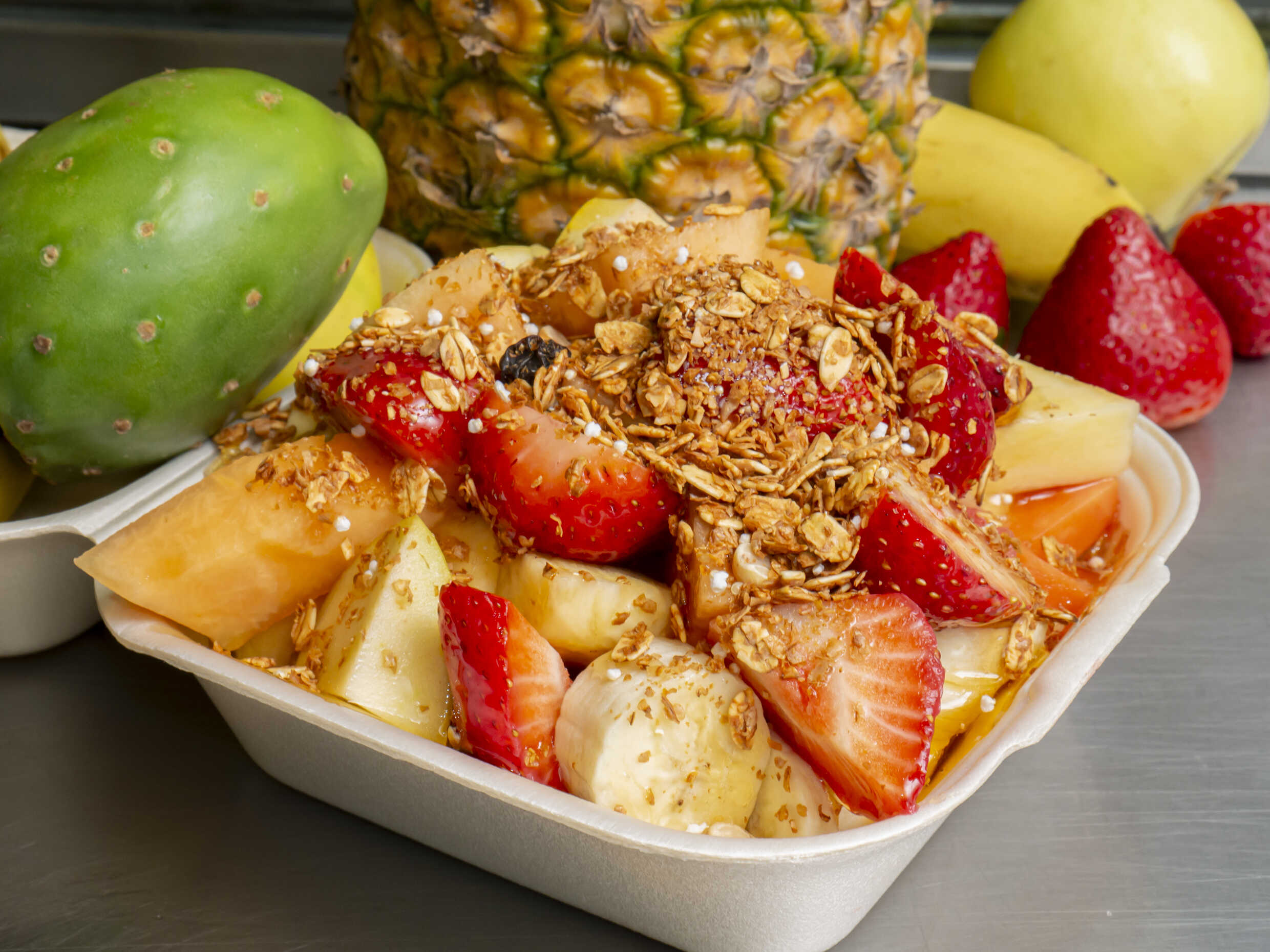 Frutas de tu elección en cóctel, con miel, granola y Chantilly.