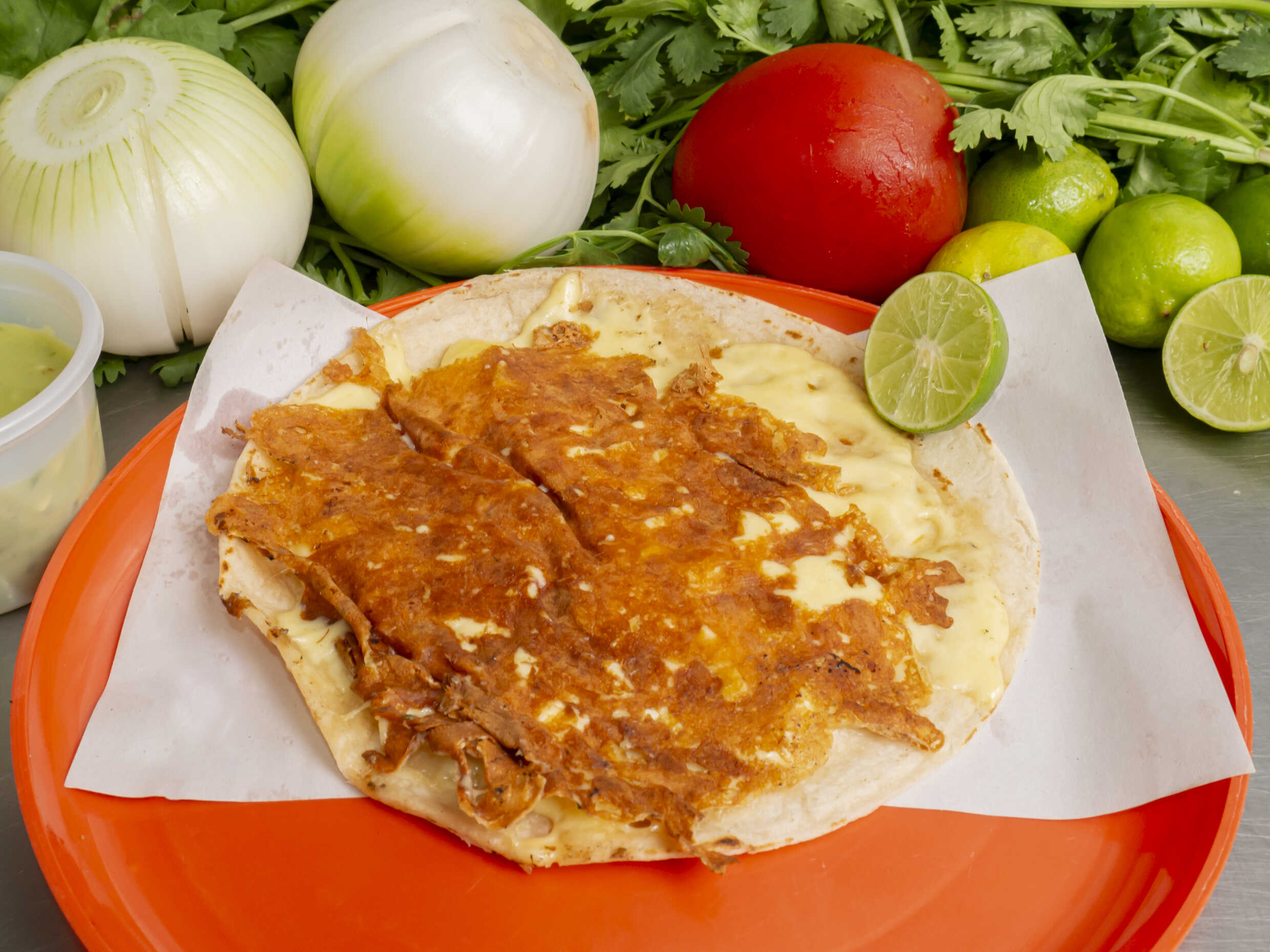 1 gringa, carne de tu elección con queso en una tortilla de harina, limones