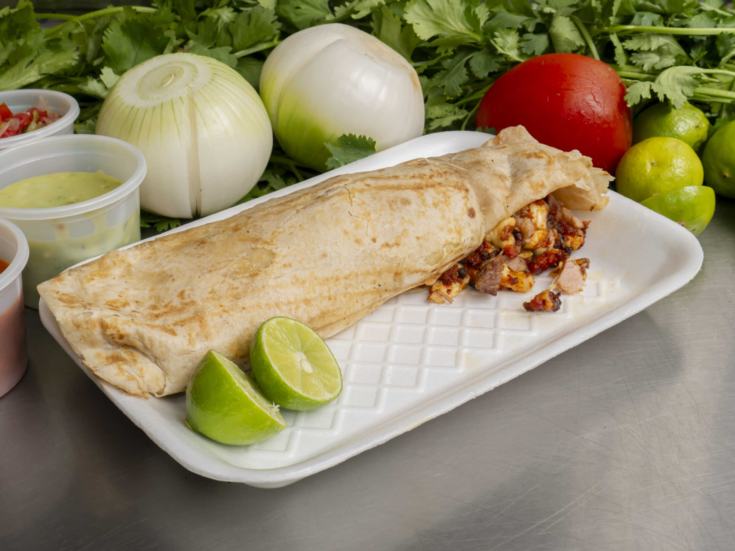 Con proteína de tu elección, en tortilla de harina grande con frijoles y queso.