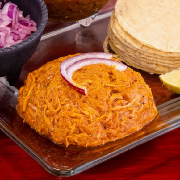 1 Kilo de Cochinita Pibil, incluye tortillas, salsa, cebolla morada y limones.