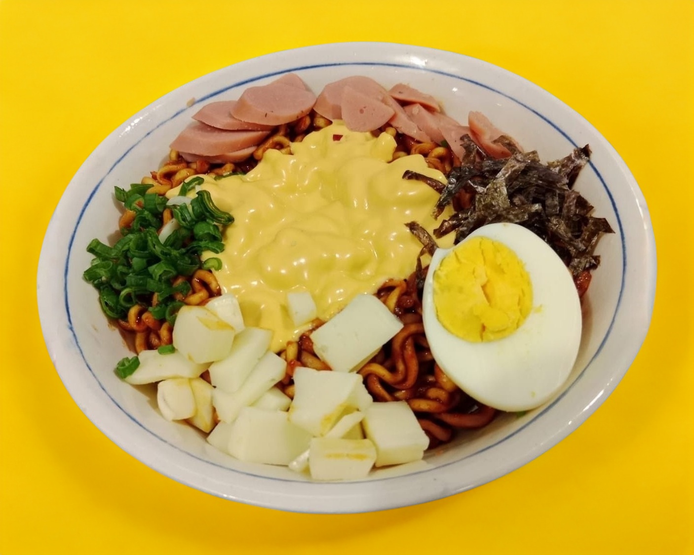 Ramen marca MARUCHAN, va sin caldo, preparada con queso tipo americano, queso mozarella, salchicha frita, 1 pieza de huevo cocido, alga Marina deshidratada y cebollin