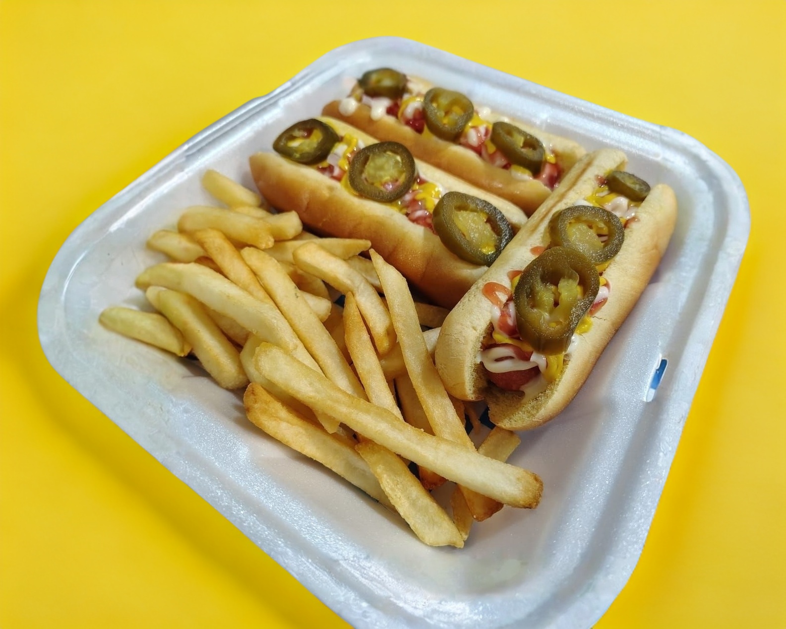 3 Hot dog sencillo con salchicha de pavo, con verdura jitomate, cebolla y chiles. Aderezado con catsup, mayoneza y mostaza.