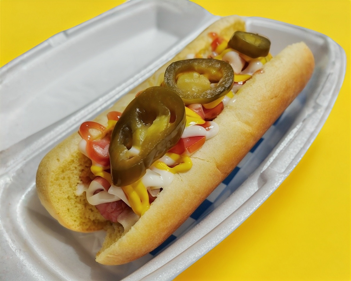 Hot dog sencillo con salchicha de pavo, con verdura jitomate, cebolla y chiles. Aderezado con catsup, mayoneza y mostaza.