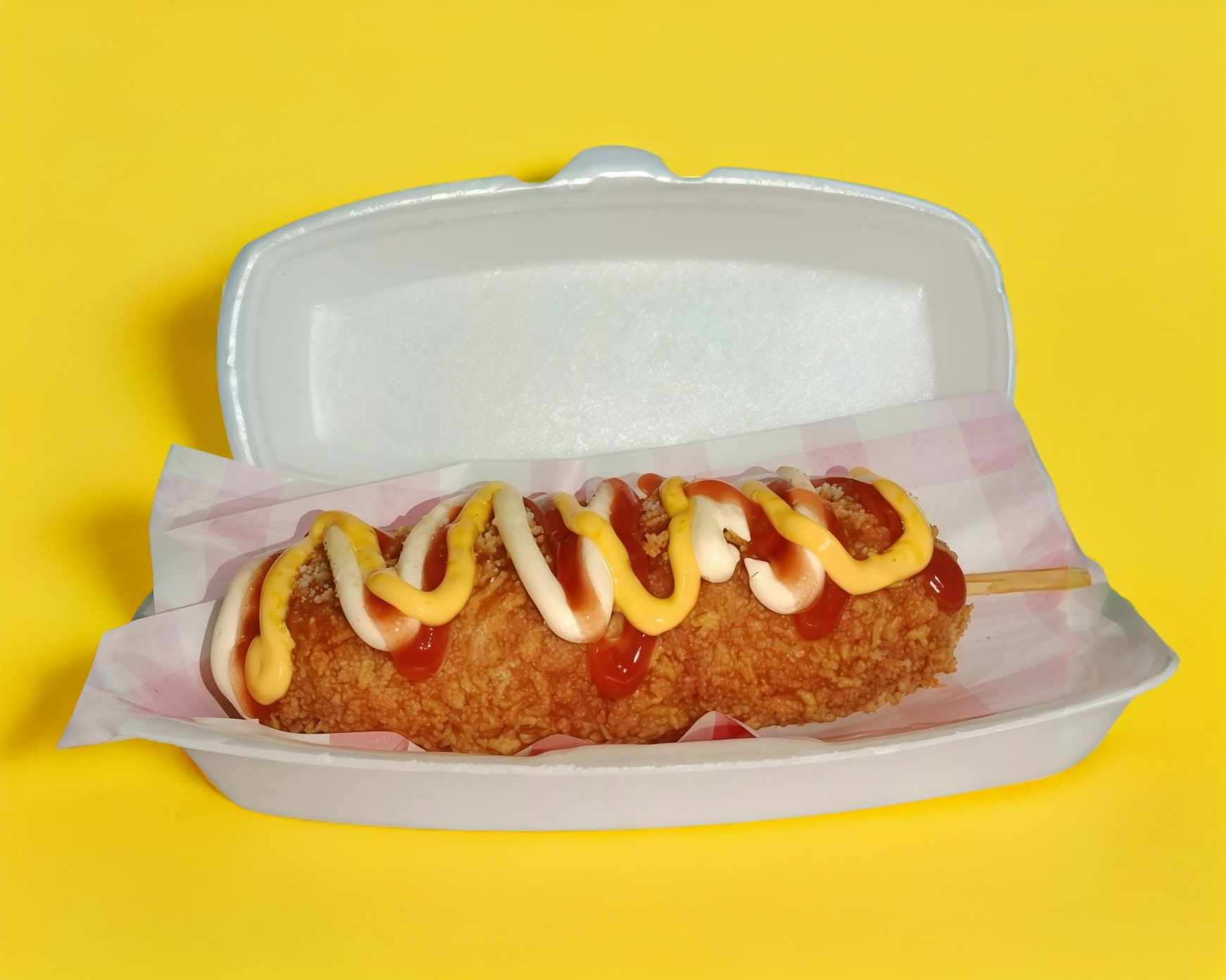 Banderilla súper crujiente estilo coreano, con salchicha Frankfurt y panko doradito, servida con mezcla de salsas, queso para nachos y un toque de azúcar que la hace irresistible.