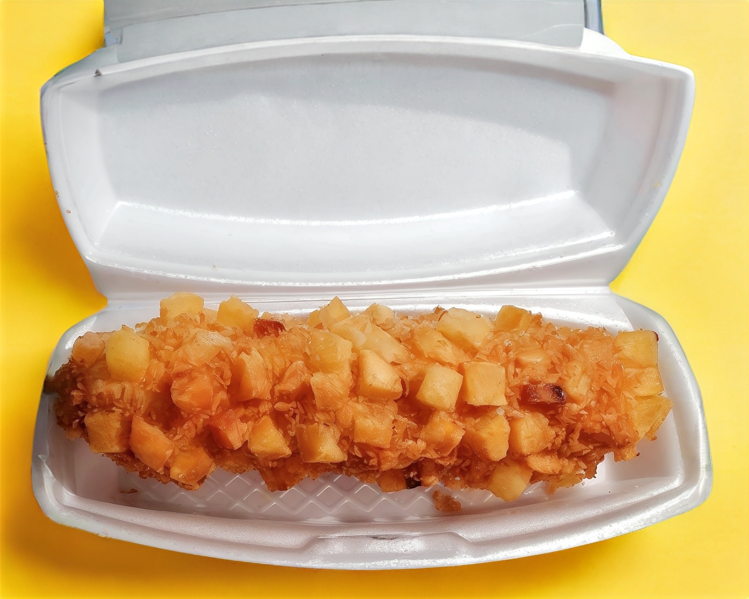 banderilla maxi, es del tamaño de una banderilla y media normal. De salchicha tipo frankfort y queso mozzarella cubierta con panko y papa