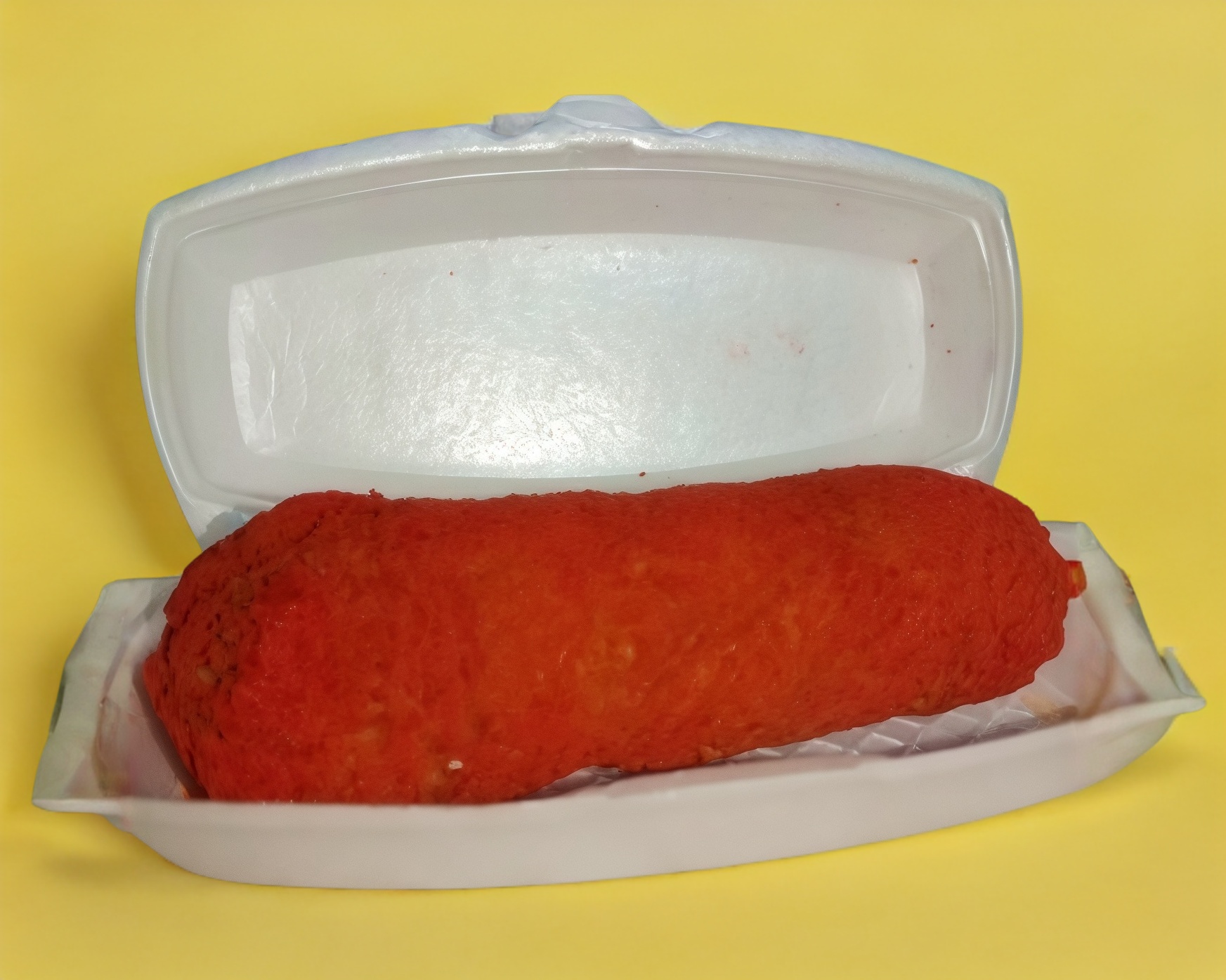 banderilla maxi, es del tamaño de una banderilla y media normal. De salchicha tipo frankfort y queso mozzarella cubierta con panko y ramen