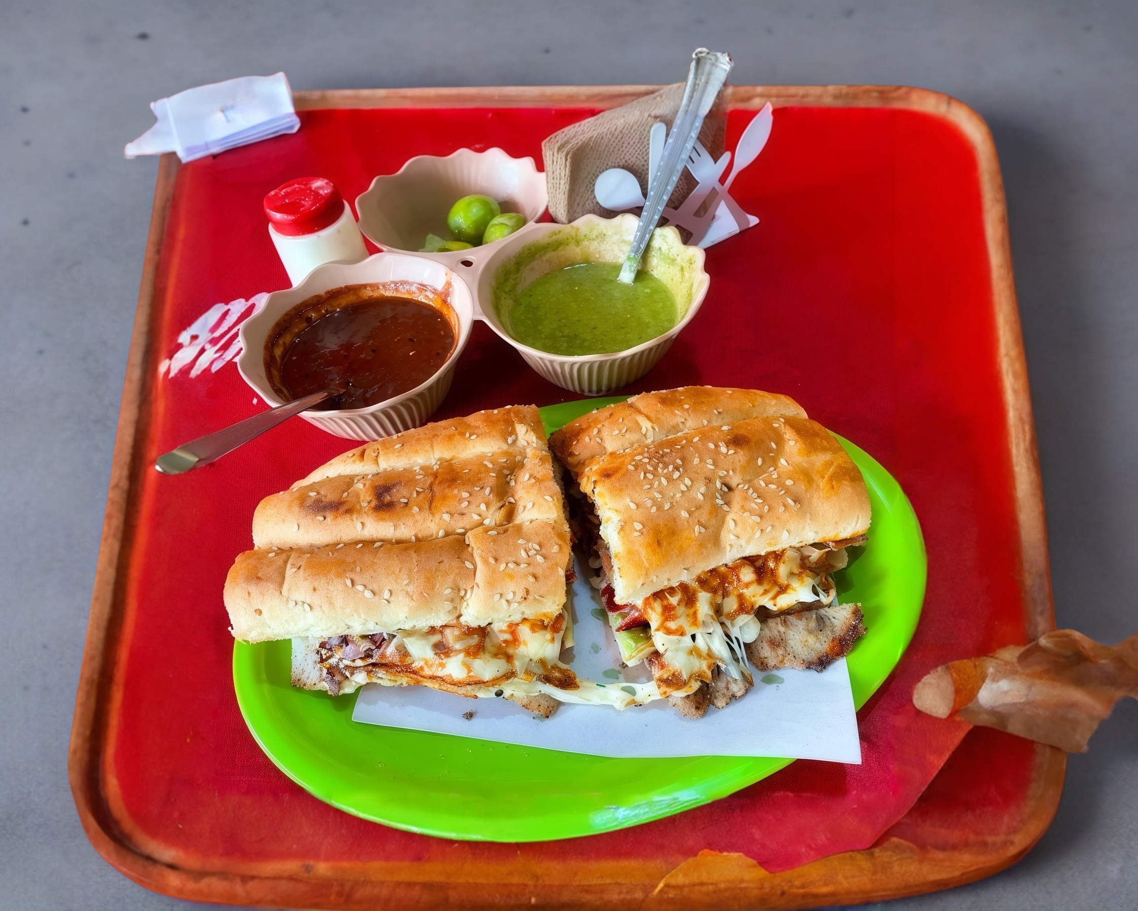 Deliciosa torta de pastor de trompo, acompañada con queso oaxaca y piña,