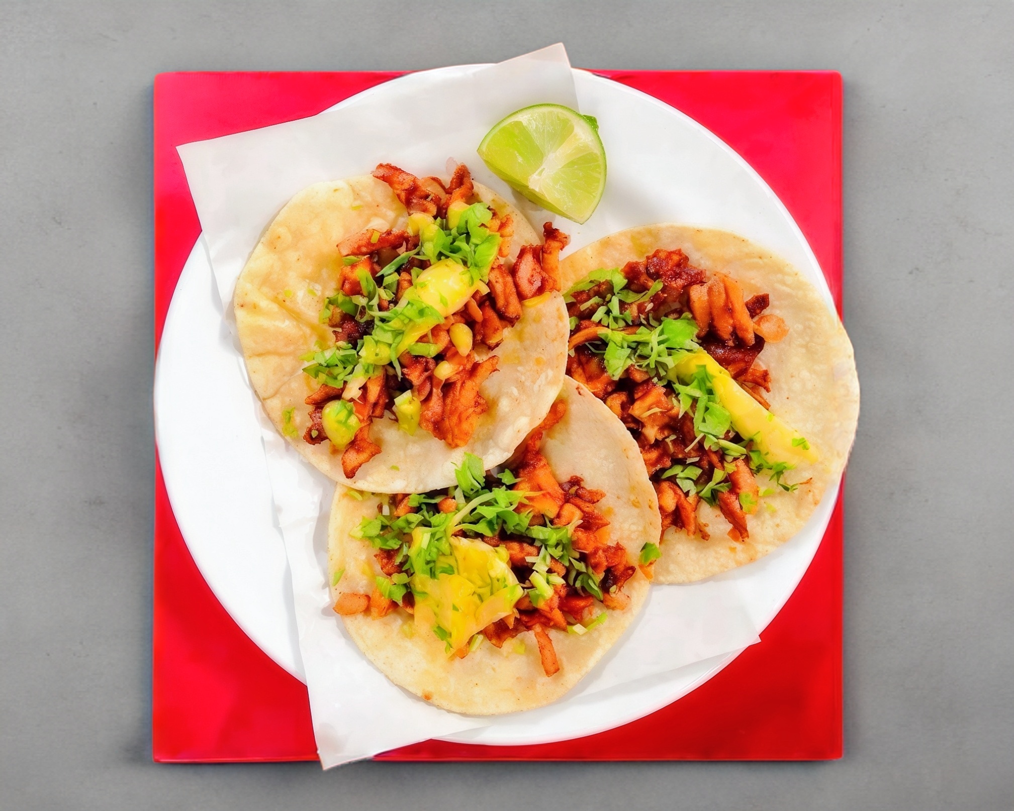 Orden de 5 tacos al pastor de trompo, incluye piña, salsa, limones y verdura (cilantro y cebolla) por aparte.