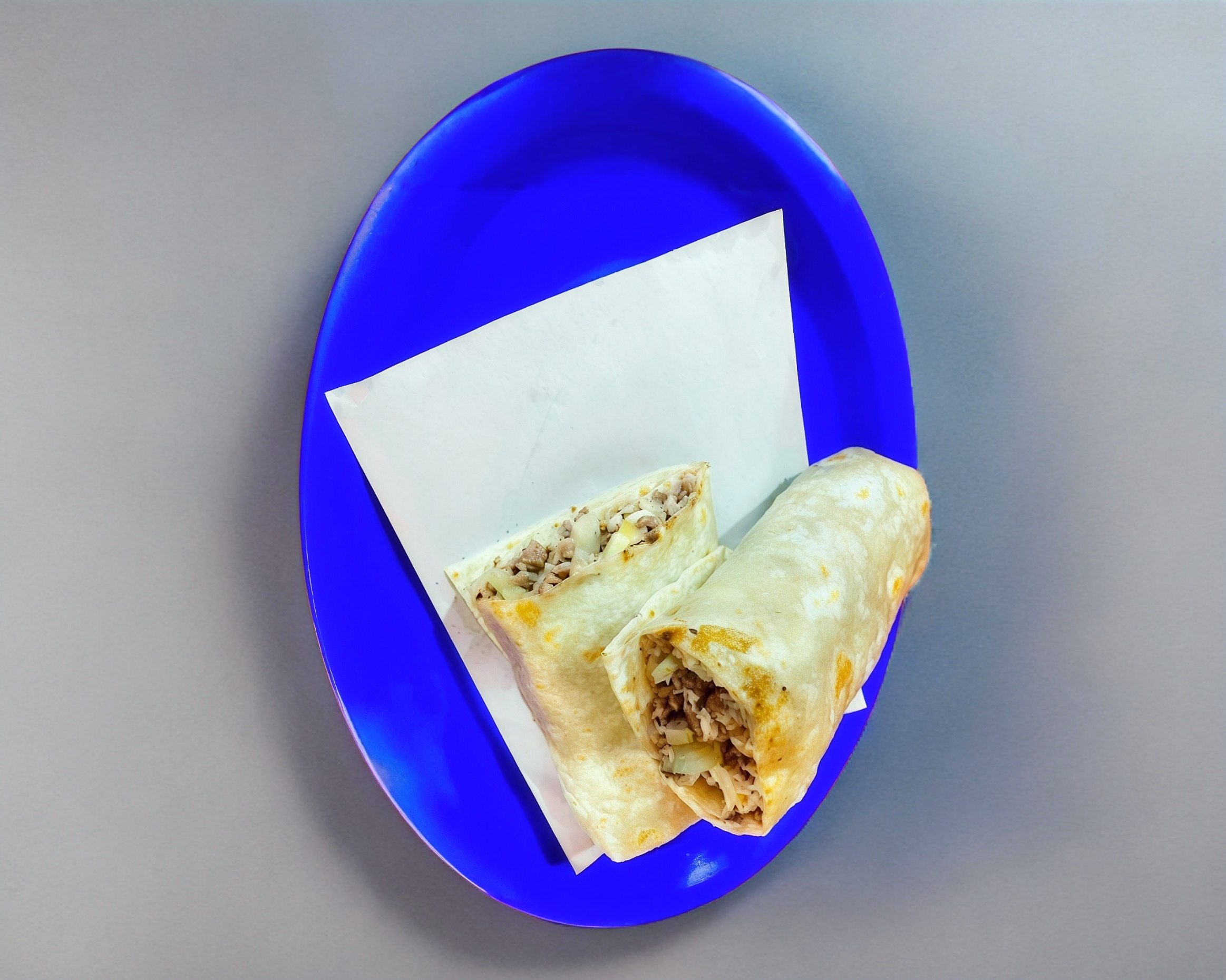 Rico burrito de pastor. incluye carne de pastor, de trompo, queso oaxaca, en tortilla grande de harina(incluye salsa roja o verde)