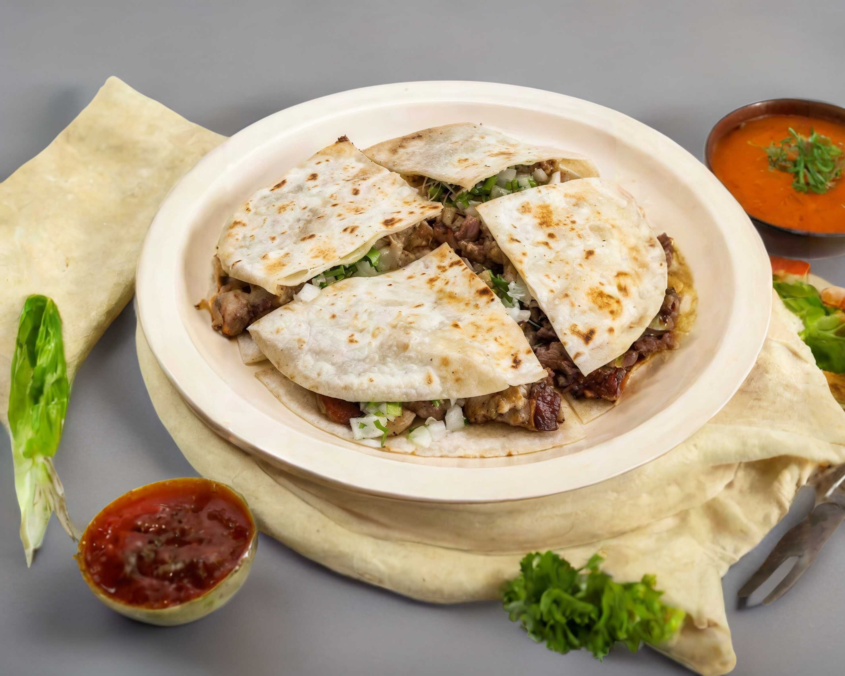 DELICIOSA TORTILLA DE HARINA DE 40 CM CON FRIJOLES CASEROS, ACOMPAÑADA CON BISTEC Y QUESO OAXACA