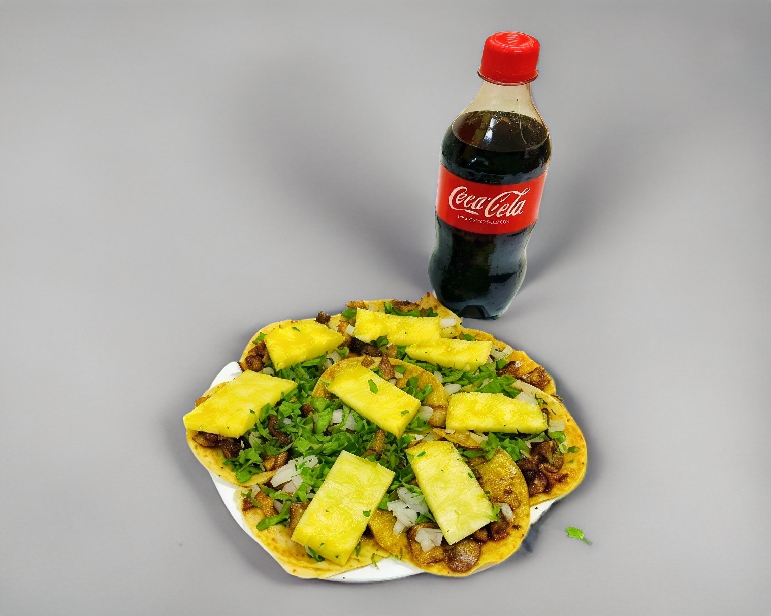Combo de 8 tacos de trompo de pastor, acompañado de una bebida de 355 ml