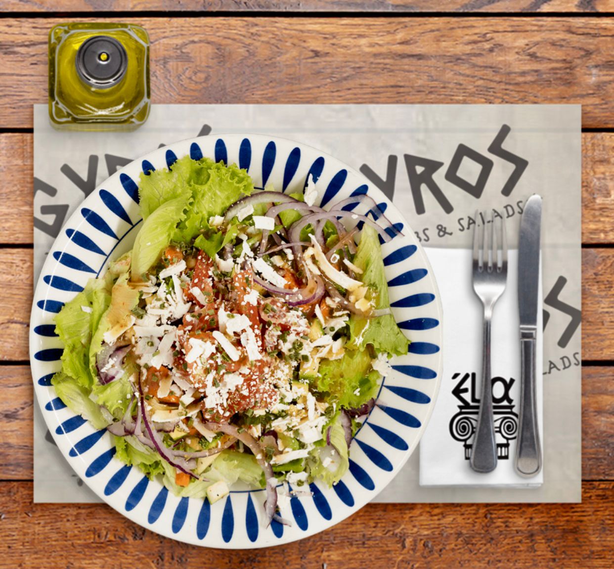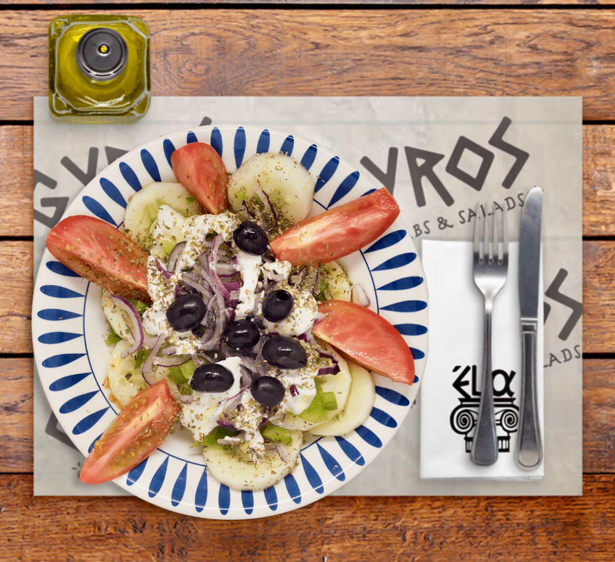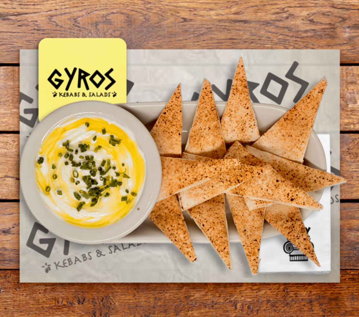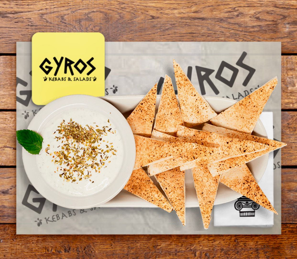Con verduras. Acompañado de papas a la francesa o aros de cebolla. ¡Gyros es el taco griego! con pan pita, con cebolla morada, jitomate y aderezado con tzatziki, y un toque de paprika.