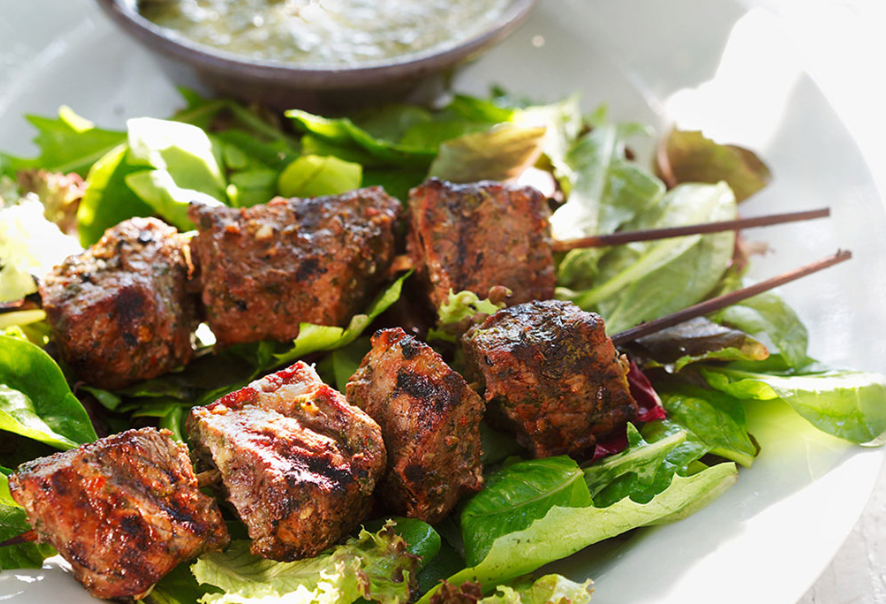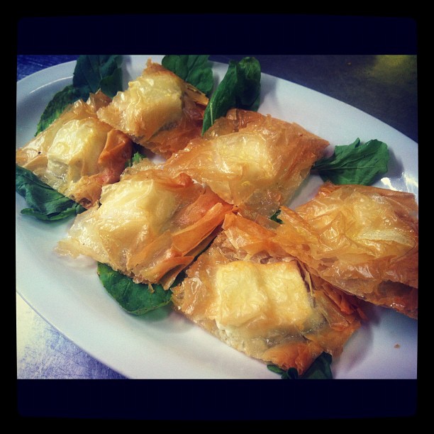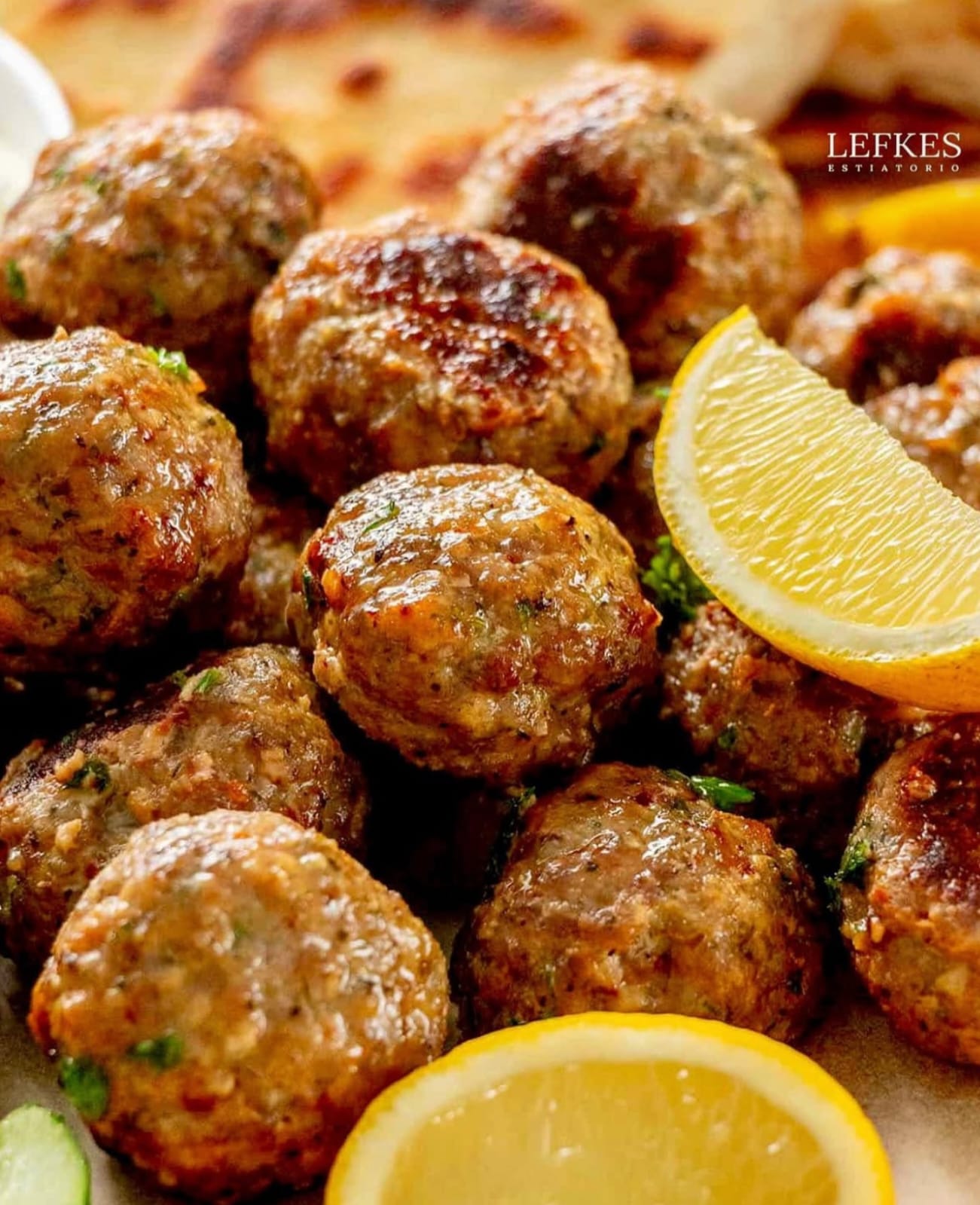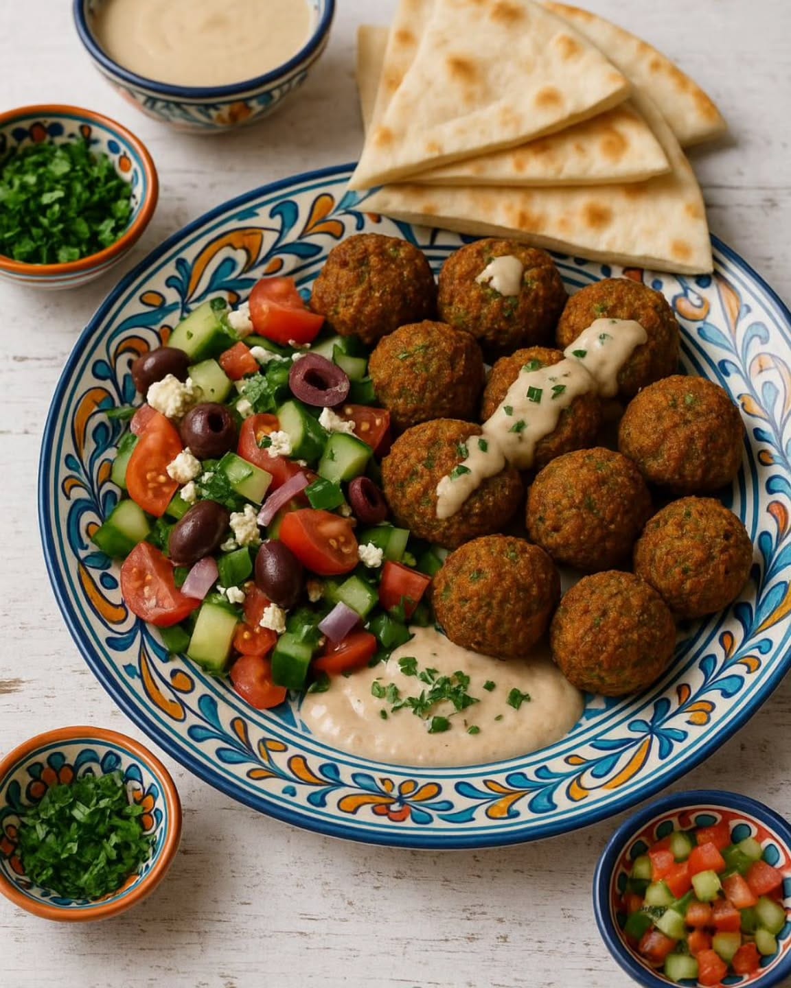Gyro, kebab o falafel, tabule, ensalada micri o ensalada griega, baklava.