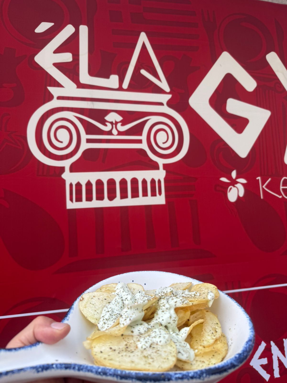 Gorditas de garbanzo, bañadas con tzatziki. Son bolitas de garbanzo acompañadas de papas griegas.