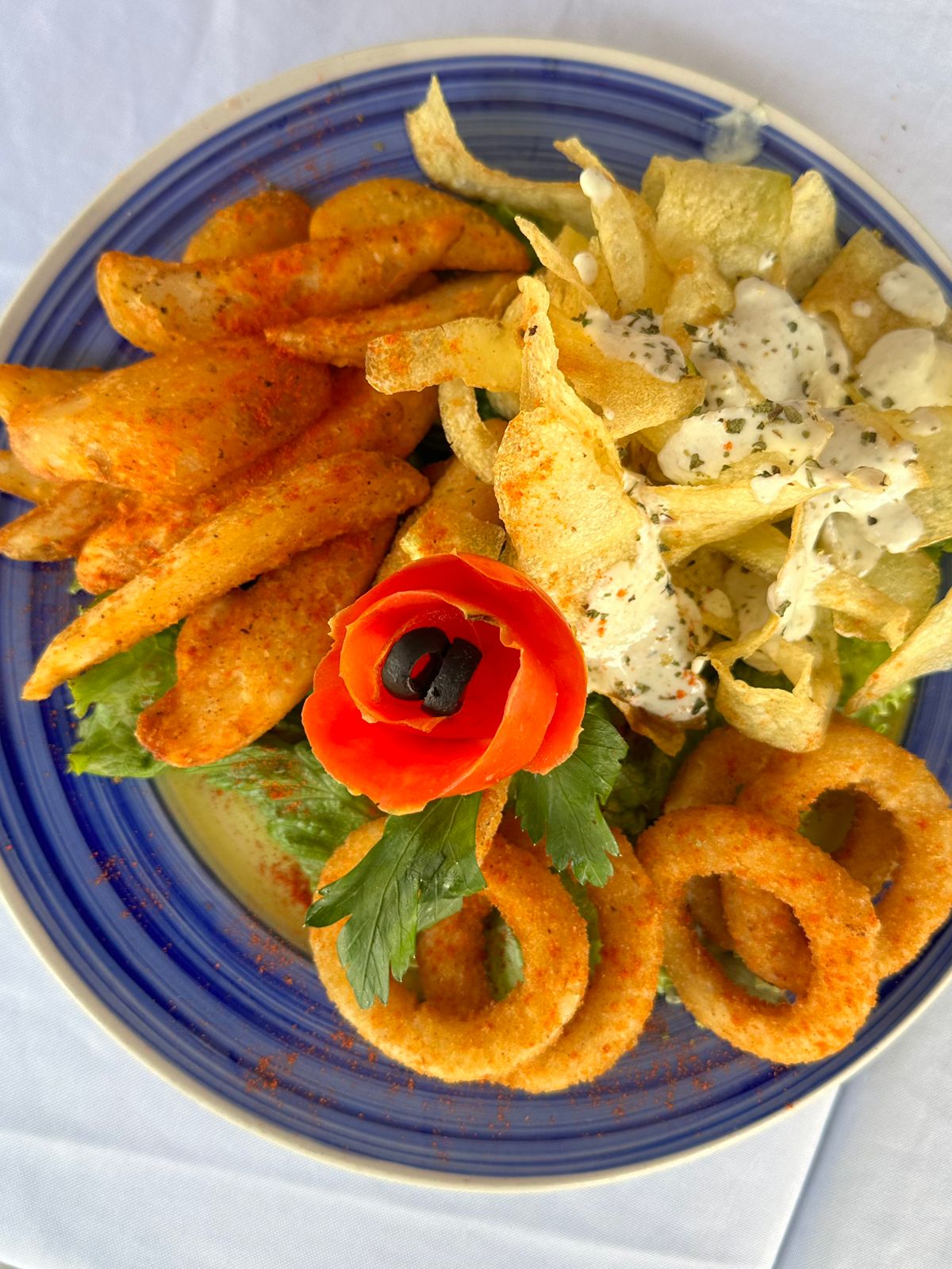 Gorditas de garbanzo, bañadas con tzatziki. Son 4 bolitas envueltas en pan pita, con jitomate, cebolla y papas a la francesa.