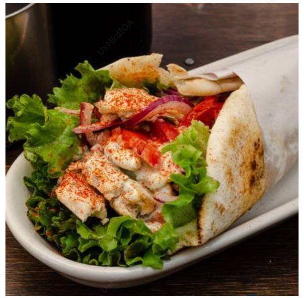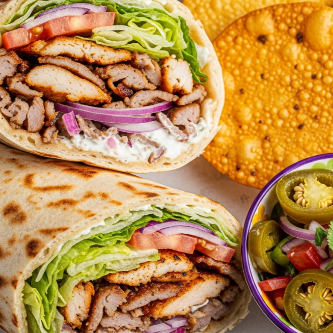 Con pollo. ¡Es el taco turco! con pan pita, una cama de lechuga italiana, cebolla morada, jitomate y aderezado con tzatziki y un toque de paprika.