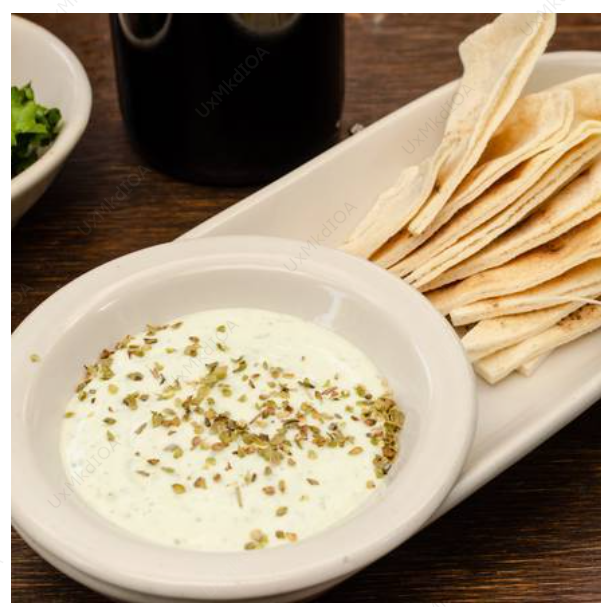 Gorditas de garbanzo bañadas con tzatziki. Compra uno y llévate uno extra.