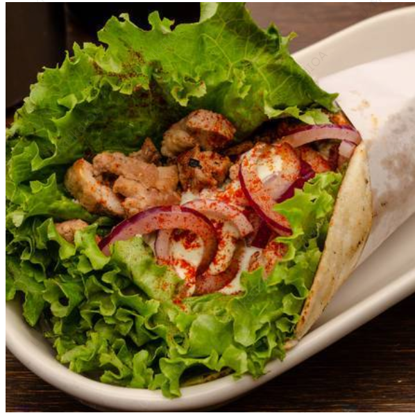 Con res. ¡Es el taco turco! con pan pita, una cama de lechuga italiana, cebolla morada, jitomate y aderezado con tzatziki y un toque de paprika.