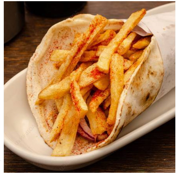 Gorditas de garbanzo bañadas con tzatziki. Son cuatro bolitas envueltas en pan pita, con jitomate, cebolla y papas a la francesa.