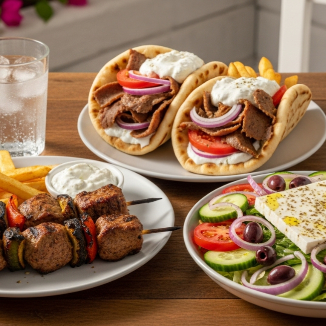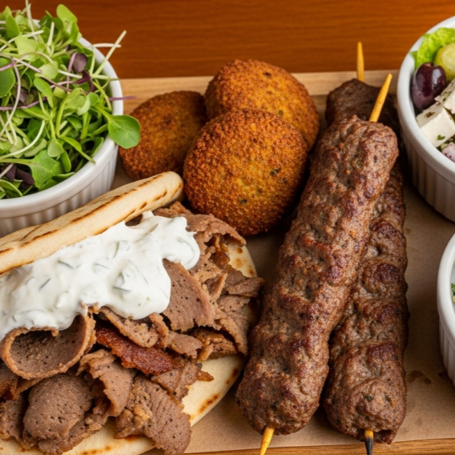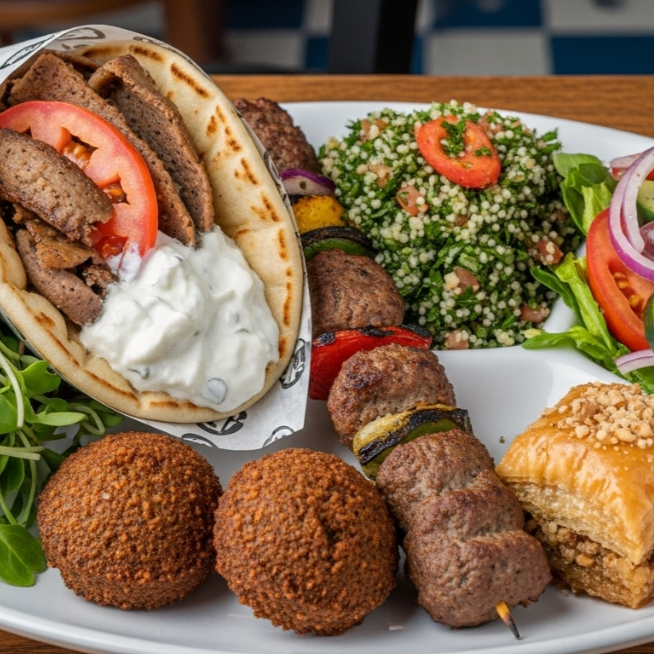 Gyro, kebab o falafel. Tabule, ensalada micri o ensalada griega. Baklava.