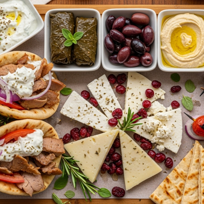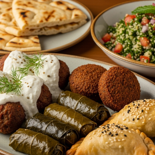 Keftedes(bolitas de carne bañadas en tzatziki), dolmades, (hojas de parra rellenas de arroz y carne), falafel, tiropitakia, (empanaditas de requesón en pasta philo), y orden de tabule con pan árabe.