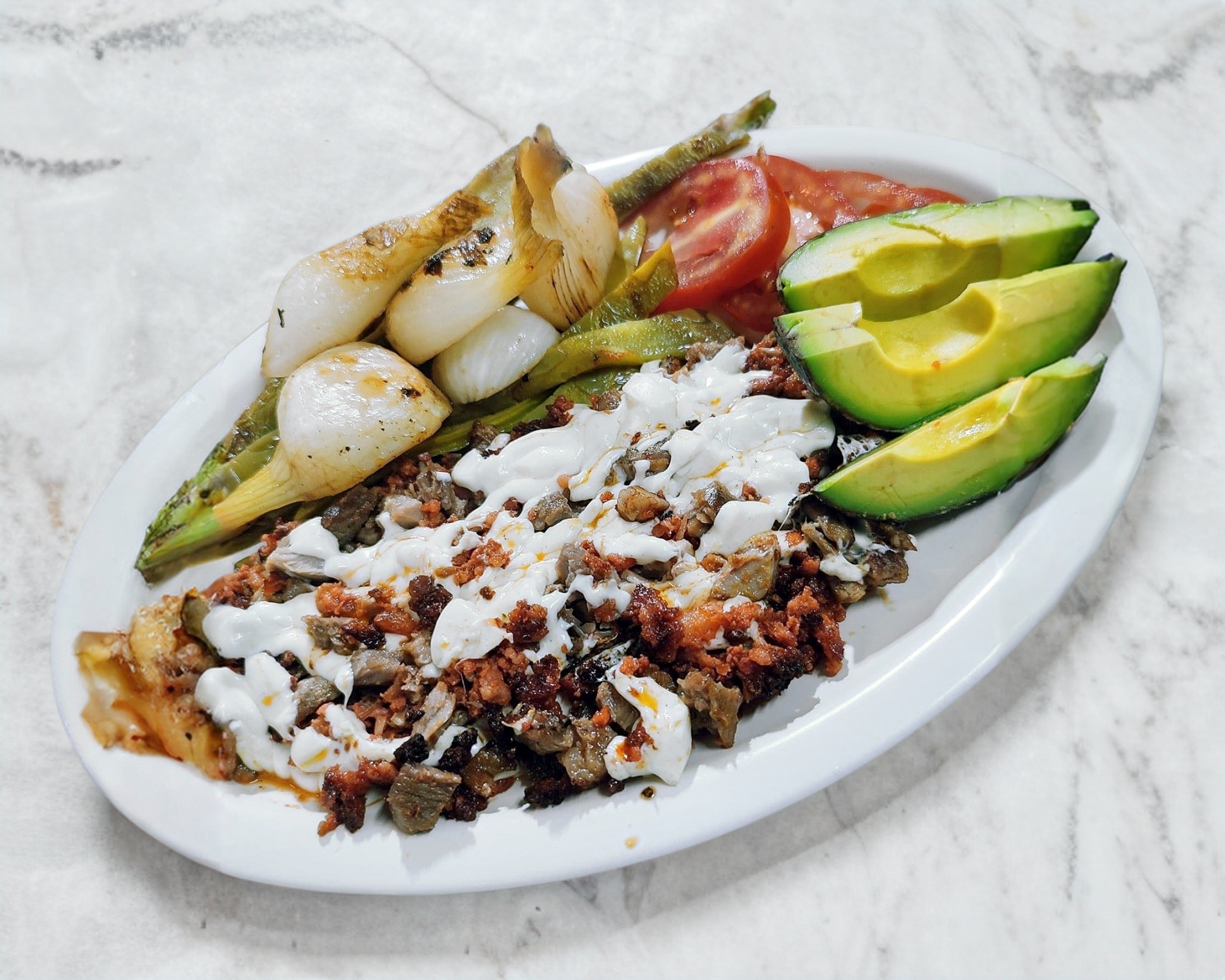 carne de bistec con pastor y quesillo acompañado de nopales, cebollotas, aguacate, jitomate y tortillas