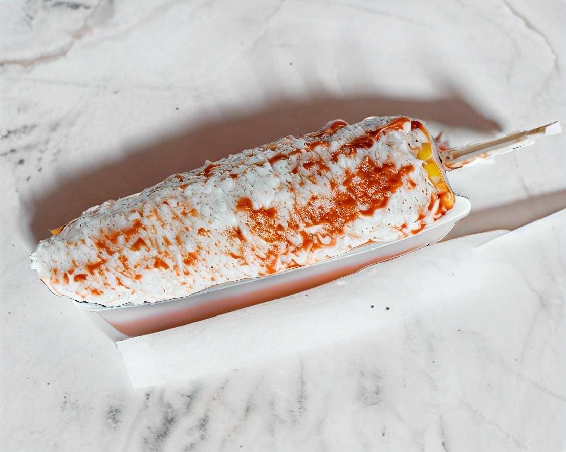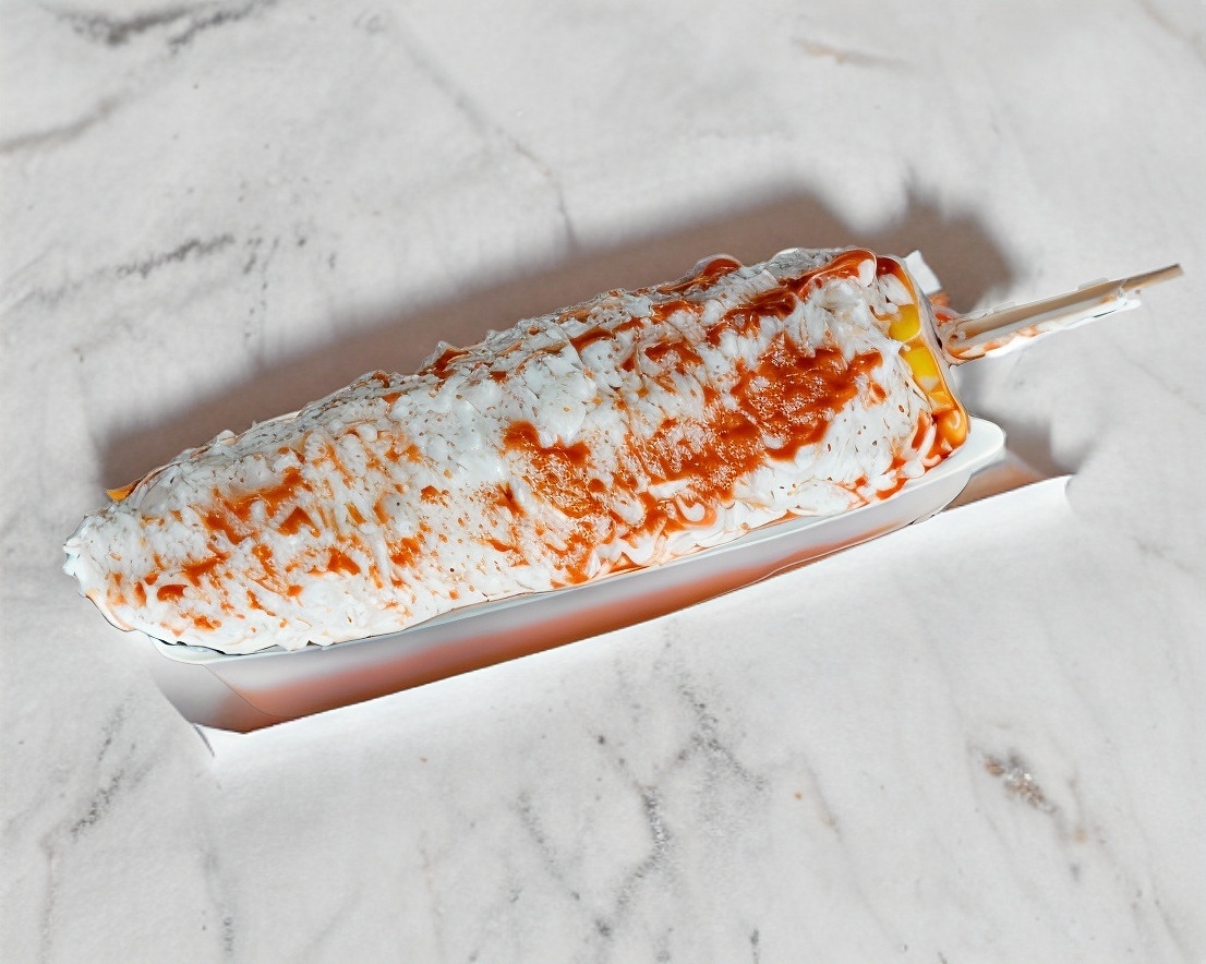 Elote Blanco, mayonesa, queso rayado y picante a elegir.