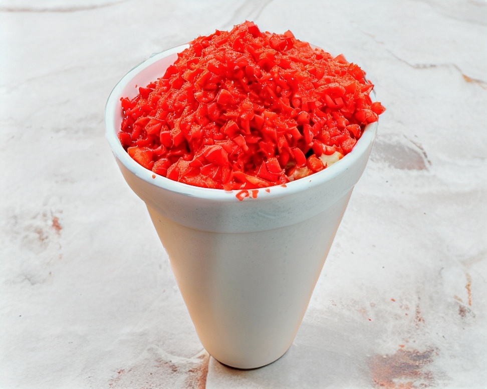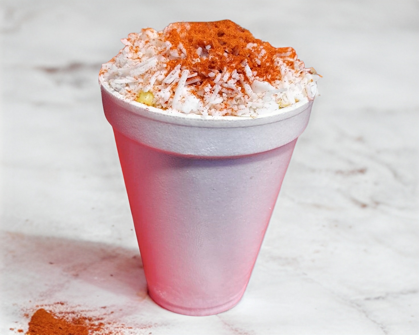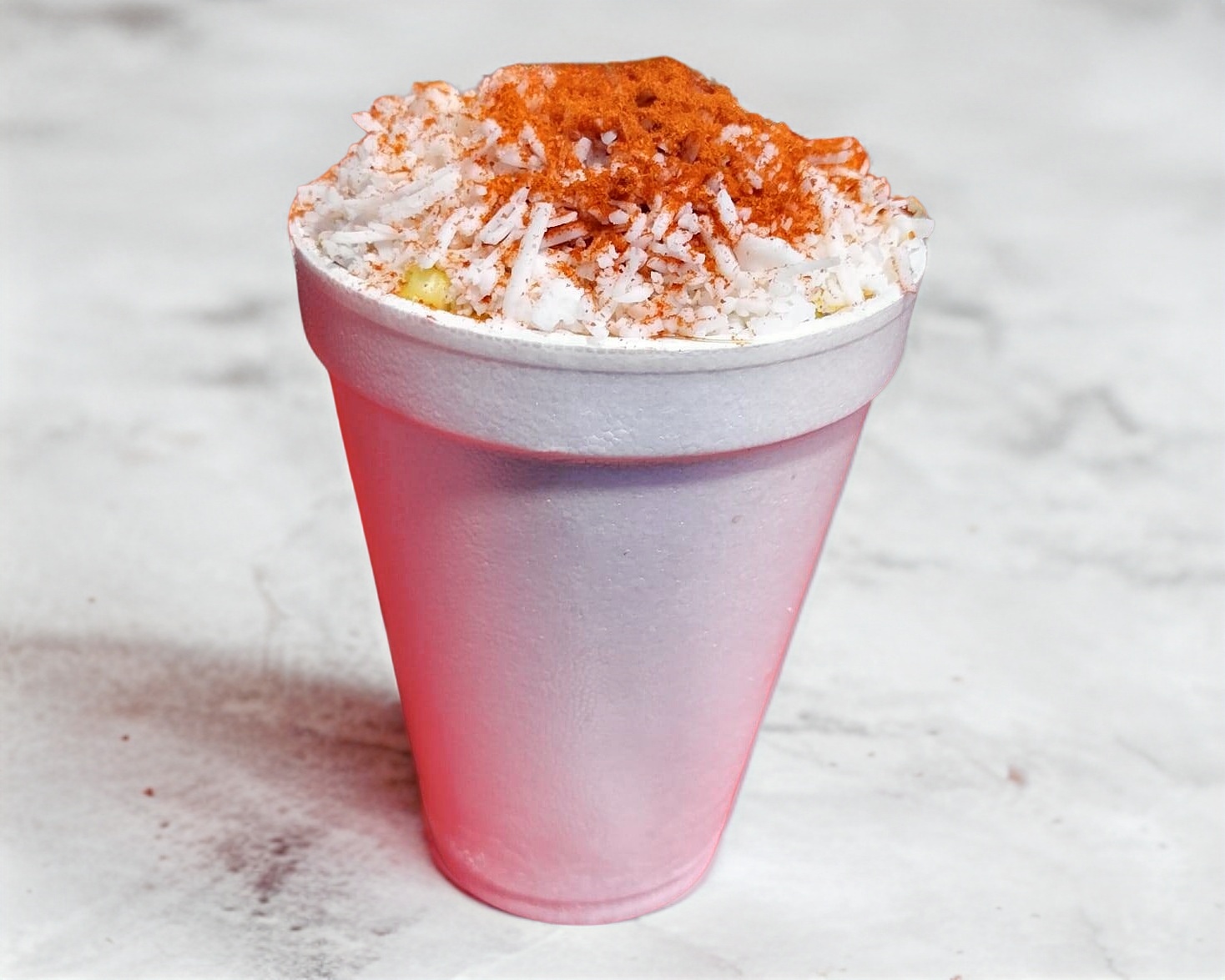 Esquites, fritura triturada (cheetos torciditos, cheetos flamin hot y/o combinado), limon, mayonesa y chile preparado y/o en polvo.