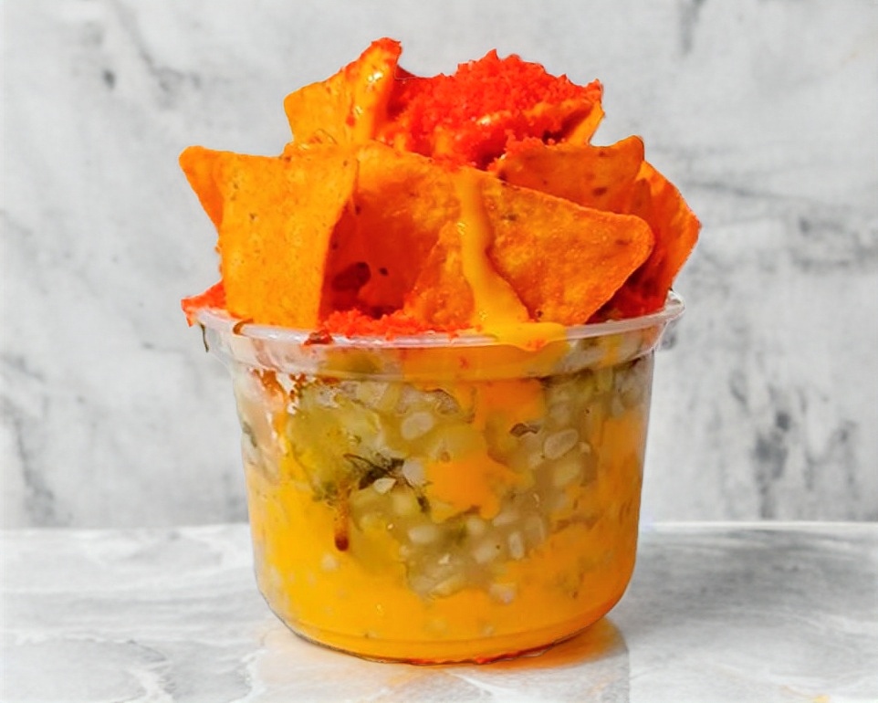 Esquites con fritura triturada (cheetos torciditos, cheetos flamin hot y/o combinado), limin, mayonesa y chile preparado y/o en polvo.