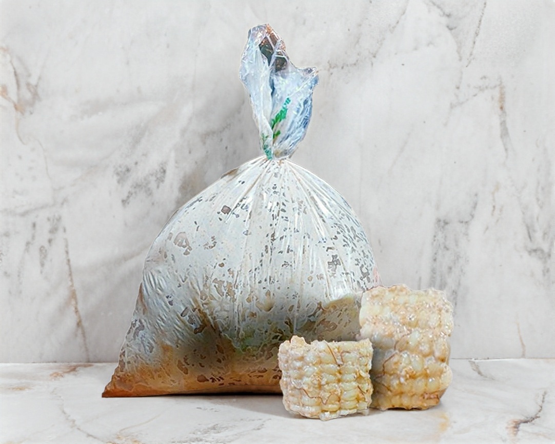 Elote blanco cortado en trozos dentro de una bolsa con mayonesa, chile a elegir, queso rayado o topping.
