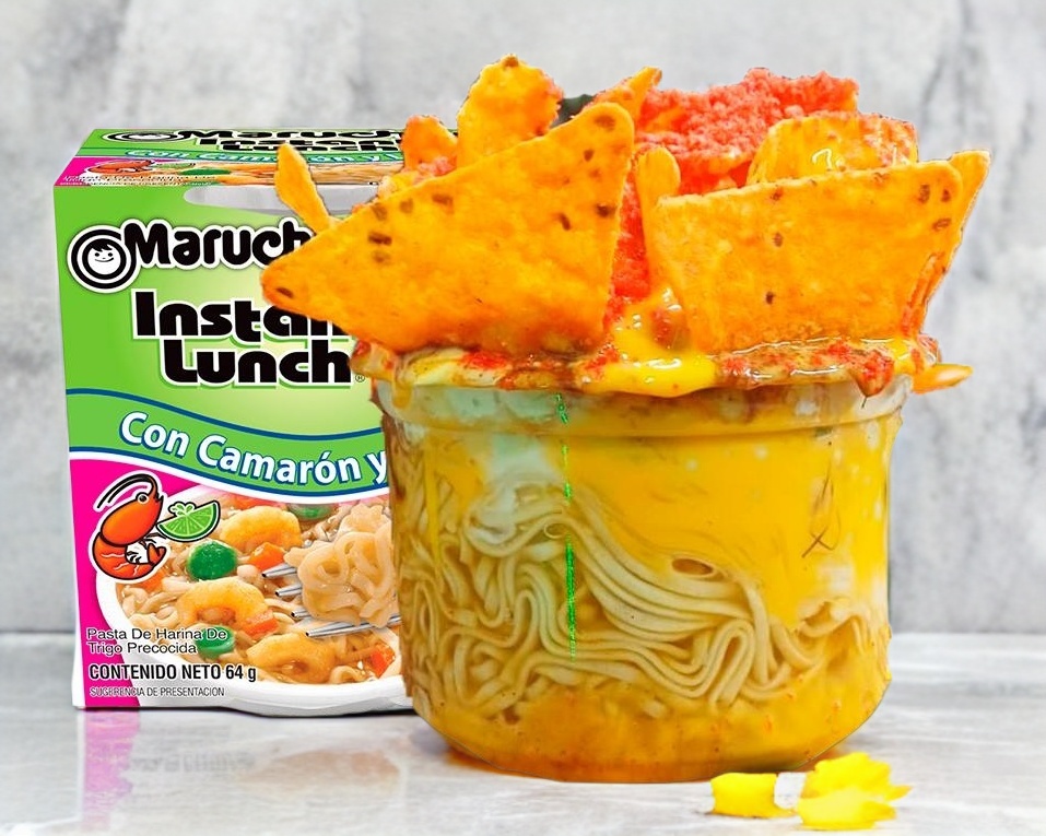 Sopa Maruchan, esquites, limón, mayonesa, chile preparado, crema, queso amarillo caliente, topping, bolsa de frituras (para su mejor empaque la bolsa de frituras va cerrada).