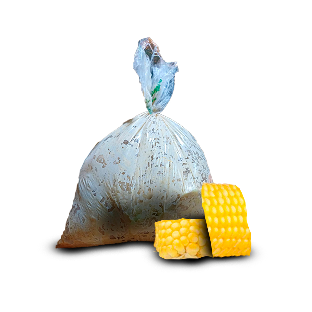 Elote amarillo cortado en trozos dentro de una bolsa con mayonesa, chile a elegir, queso rayado o topping.