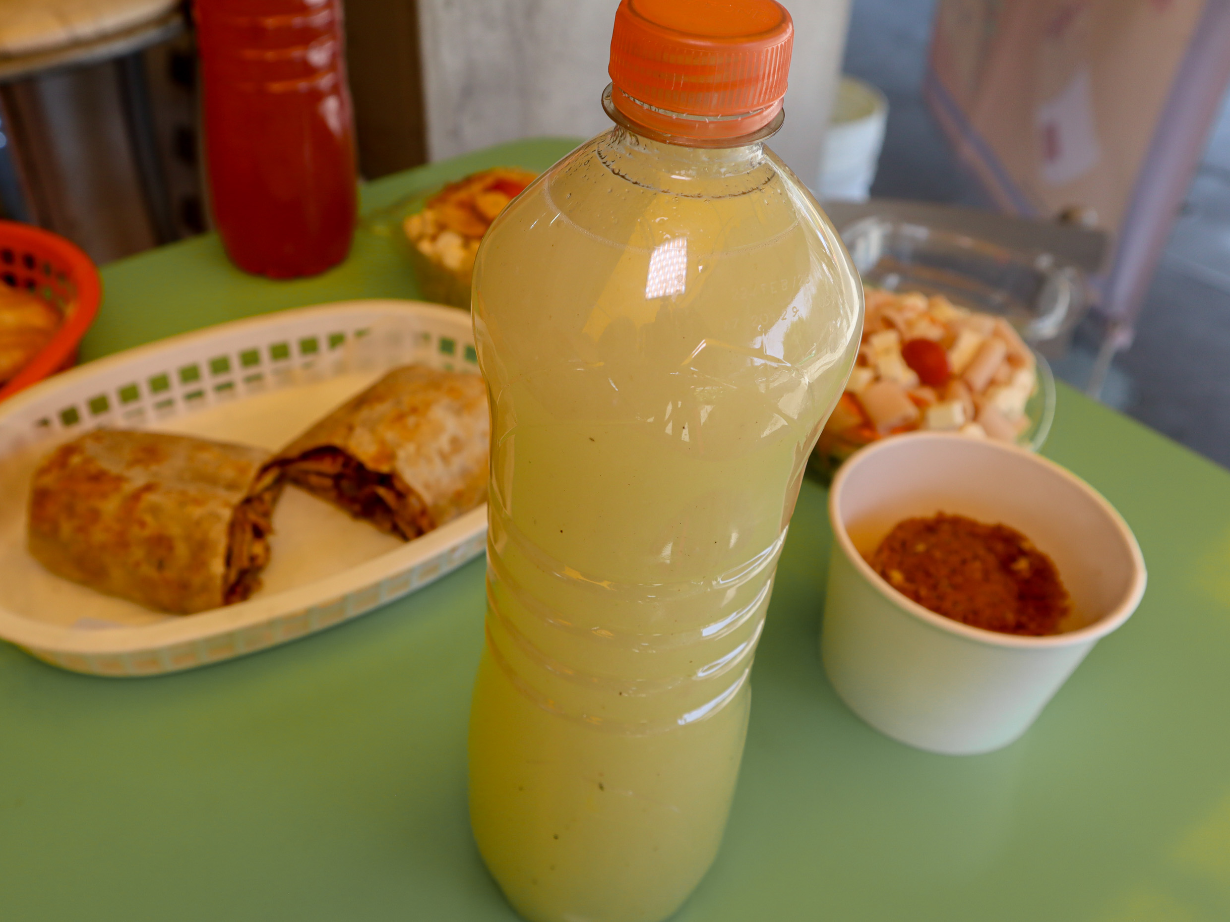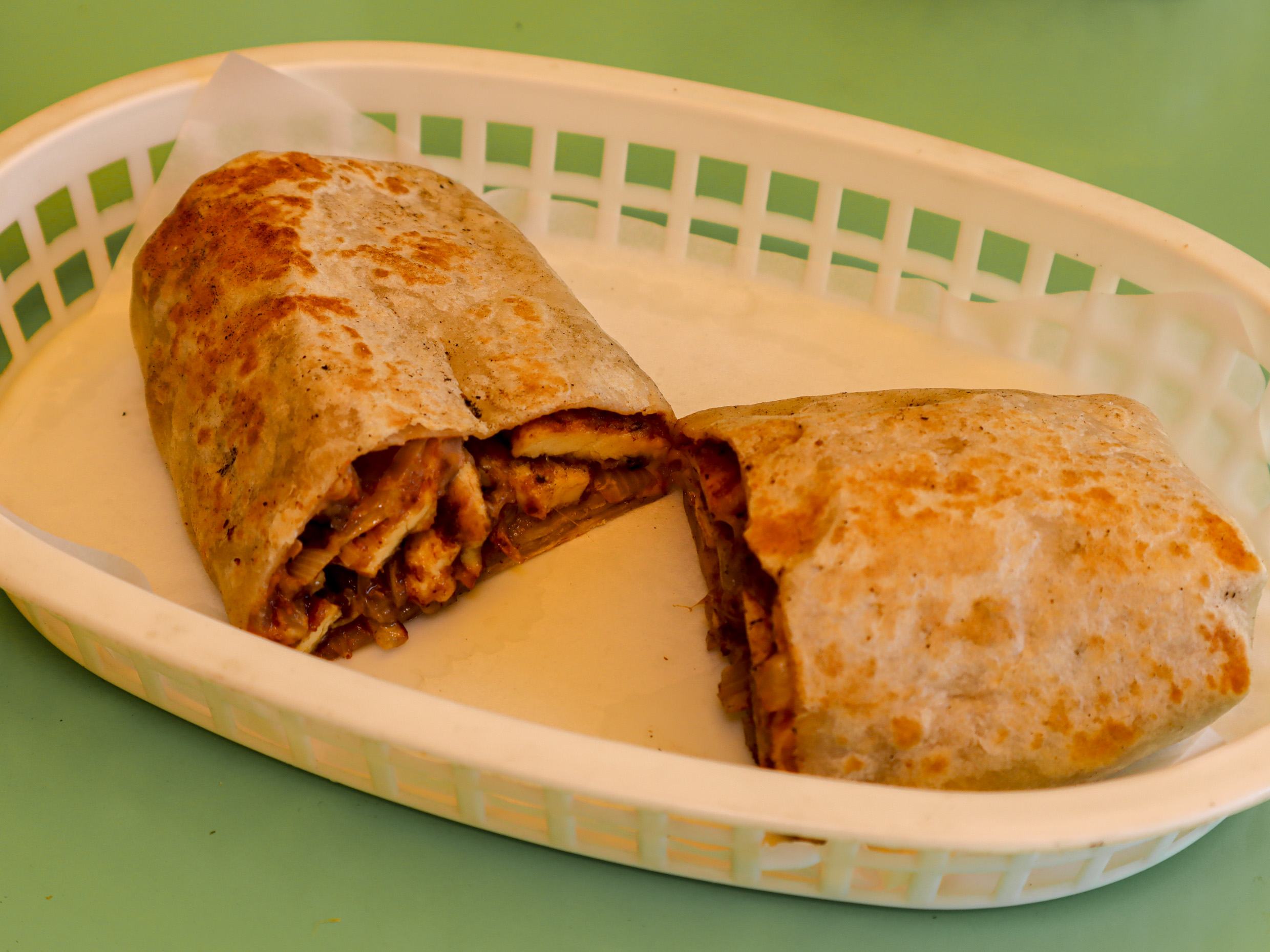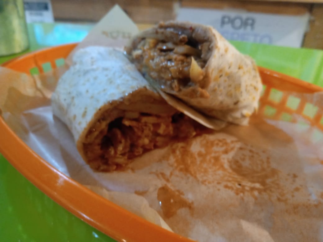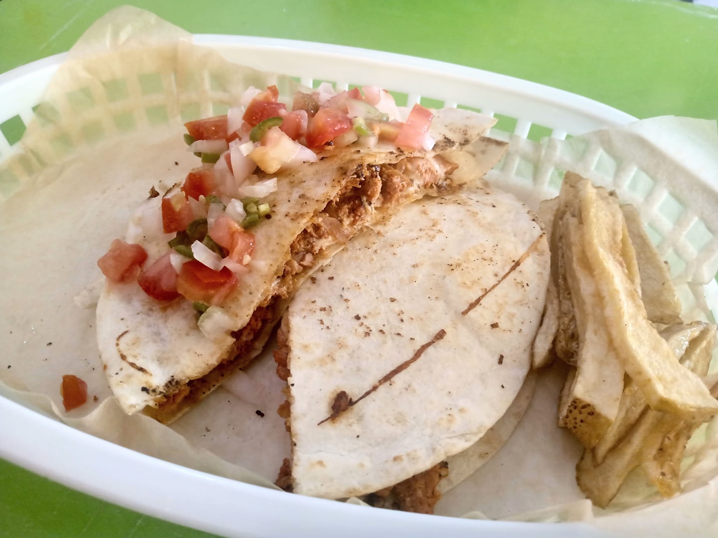 una pieza, tortilla de harina doblada, acompañada de aguacate y pico de gallo