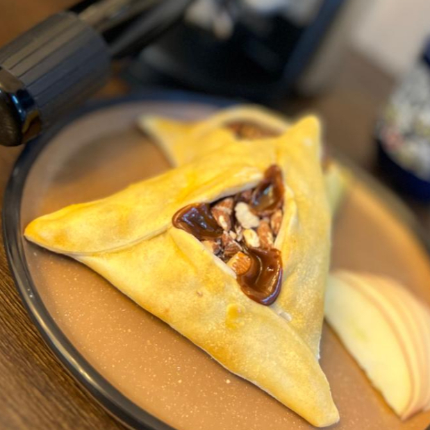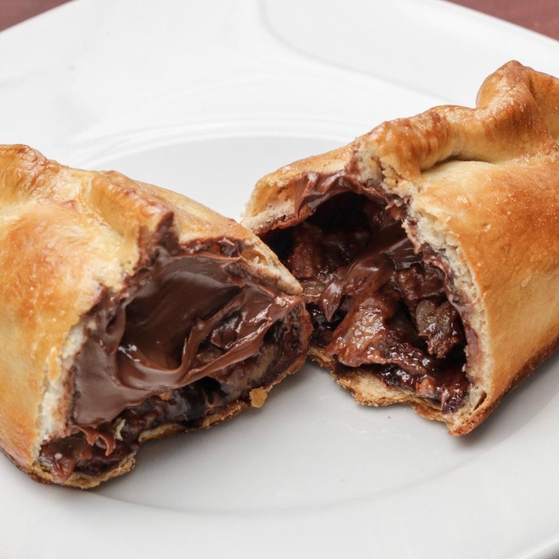 Empanada al horno rellena de Nutella, plátano y pedacitos de nuez.