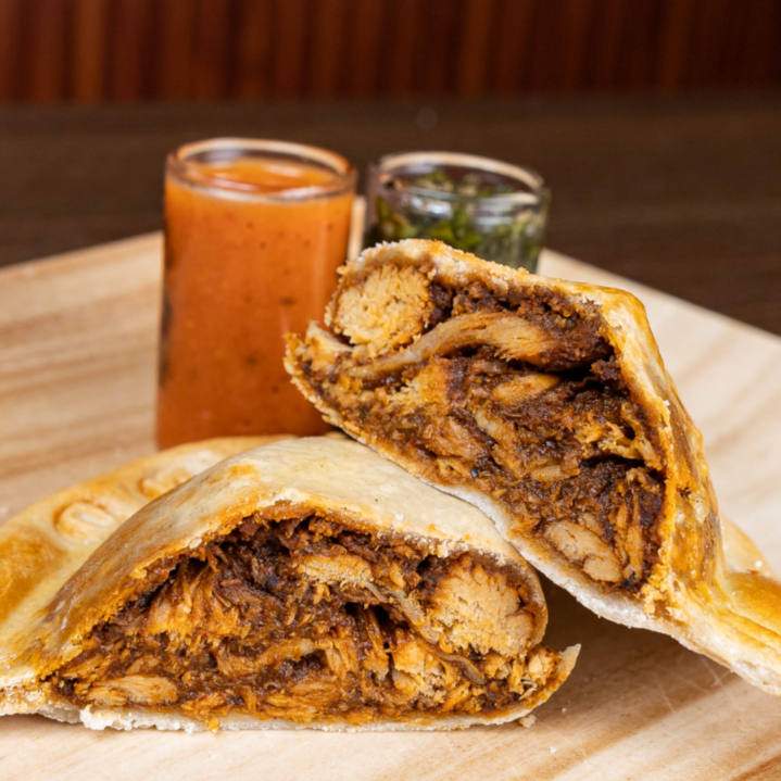 Empanada al horno rellena de mole artesanal con pollo. Nuestro mole está hecho en cazuela de barro, 100% casero.
