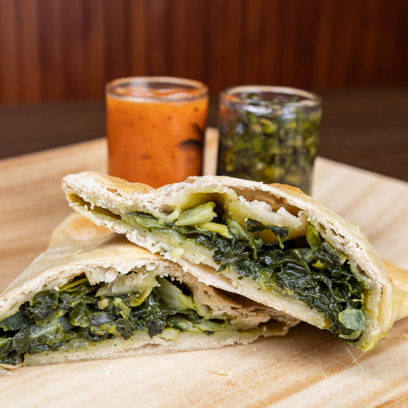 Empanada al horno rellena de espinaca, cebolla y varios quesos.