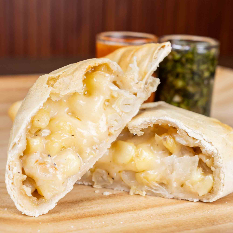 Empanada al horno de elote natural, cebolla y varios quesos.