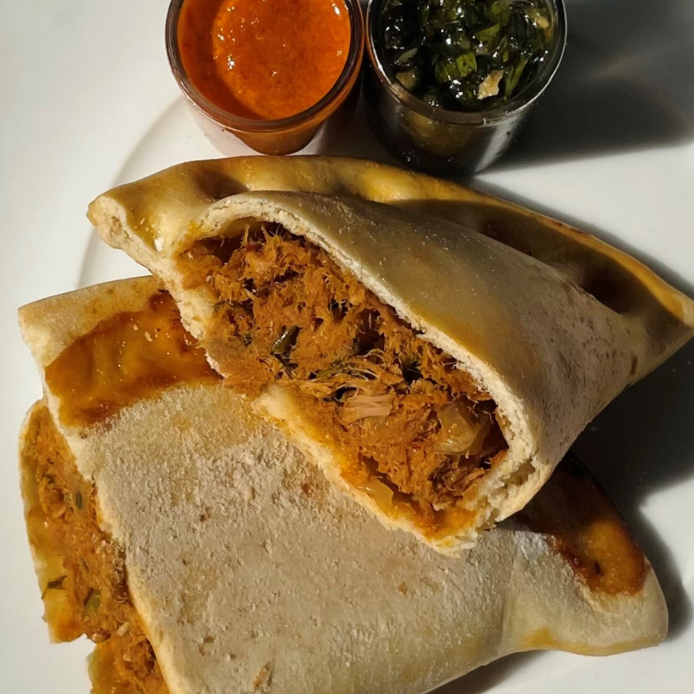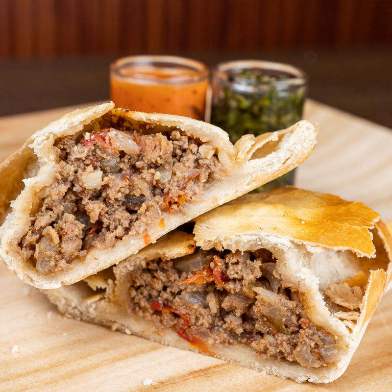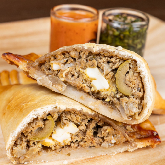 Empanada al horno rellena de carne molida premium, chile serrano, jitomate y cebolla.