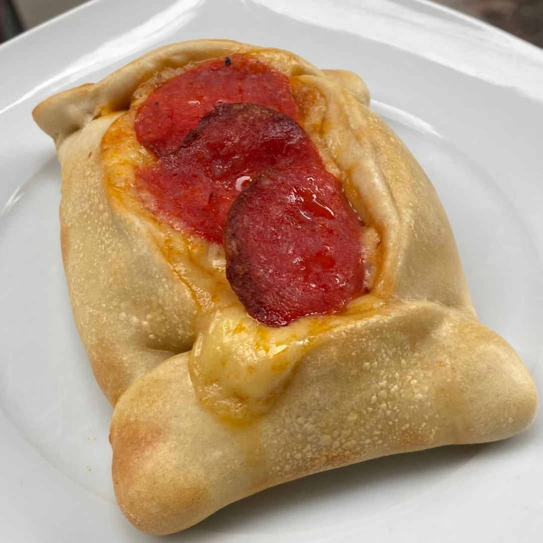 Empanada al horno hecha con queso mozzarella, pepperoni y salsa de jitomate casera que te hará recordar a una auténtica pizza de pepperoni.