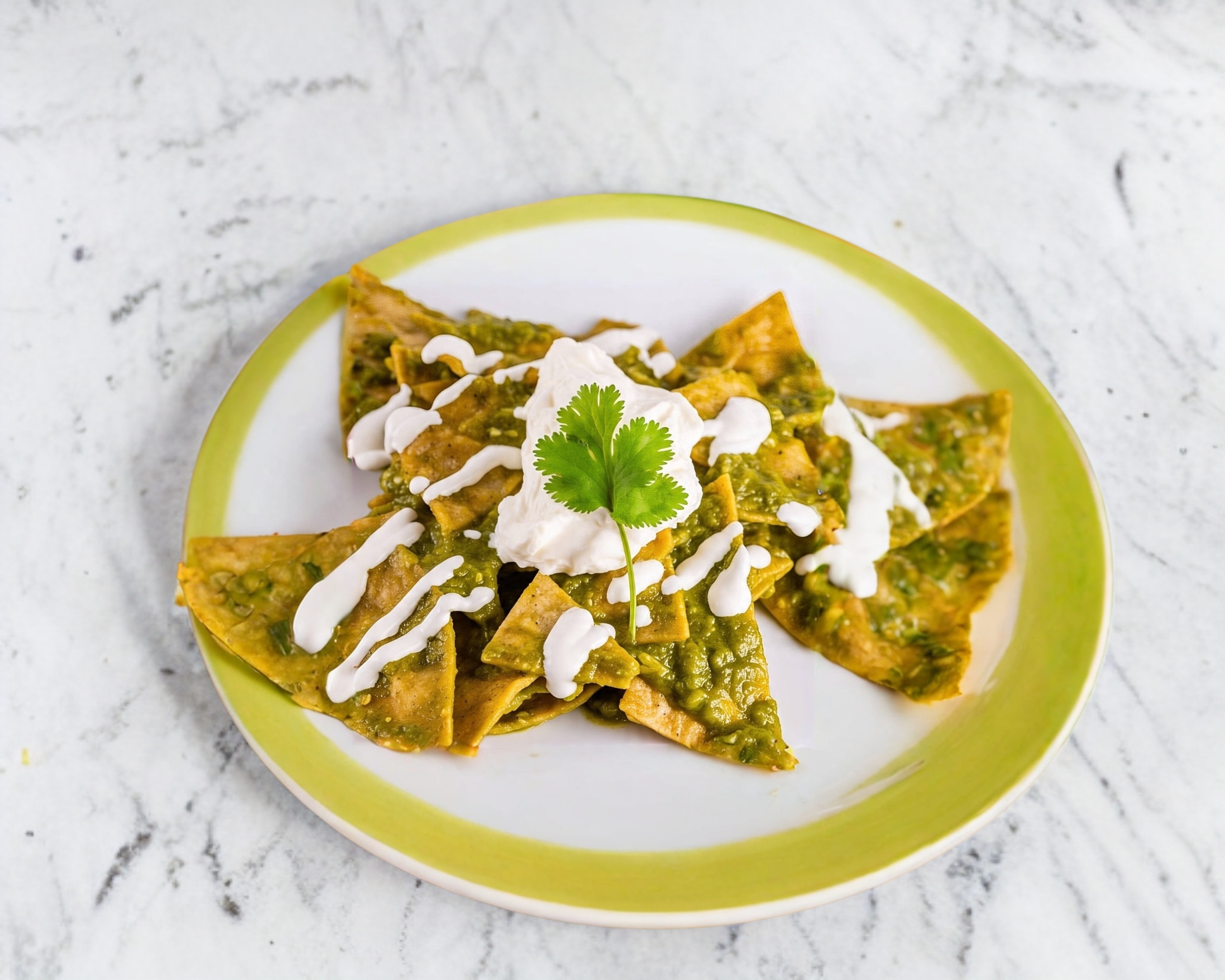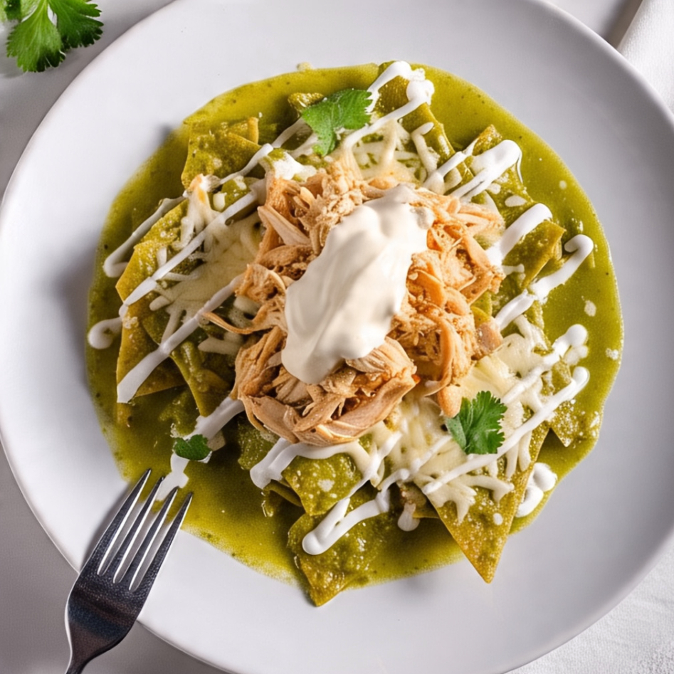 Totopos de maíz bañados en salsa verde acompañados de su crema queso, cebolla y su pollito deshebrado
