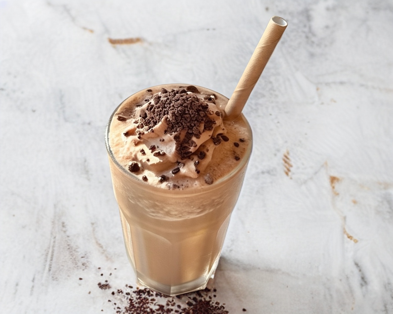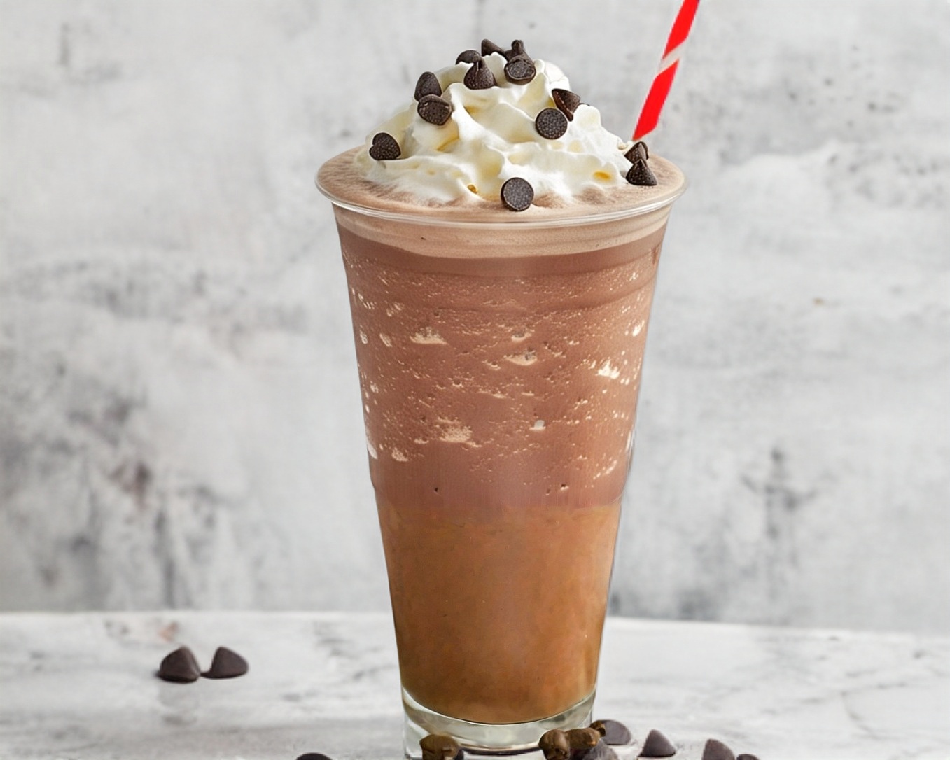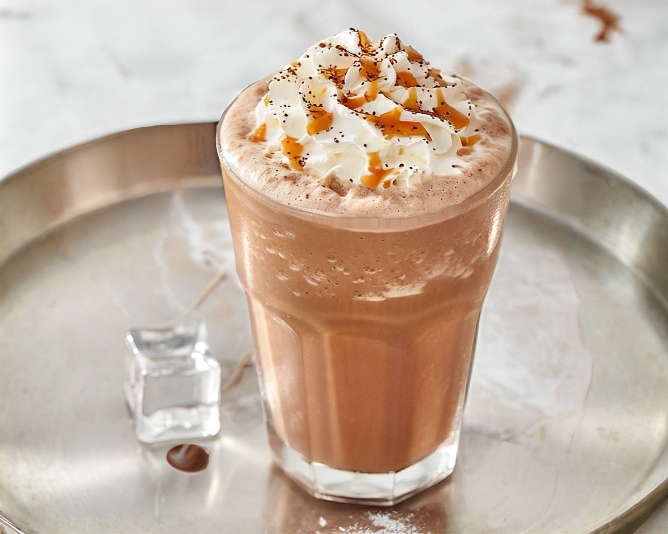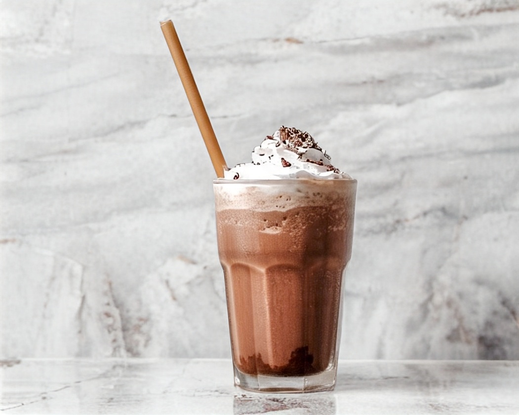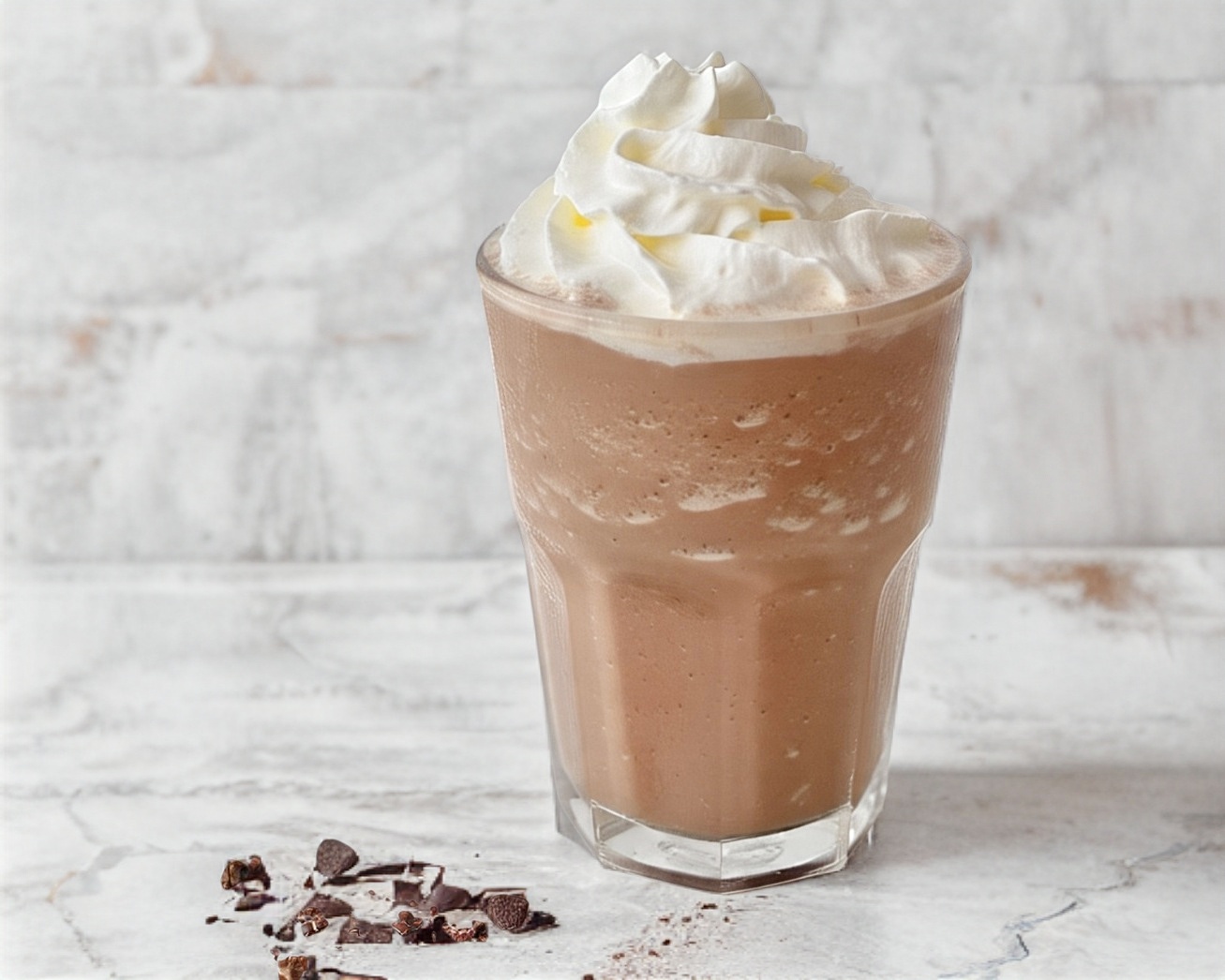 Delicioso frappé sabor chocolate y avellanas decorado con crema batida y granillo de chocolate