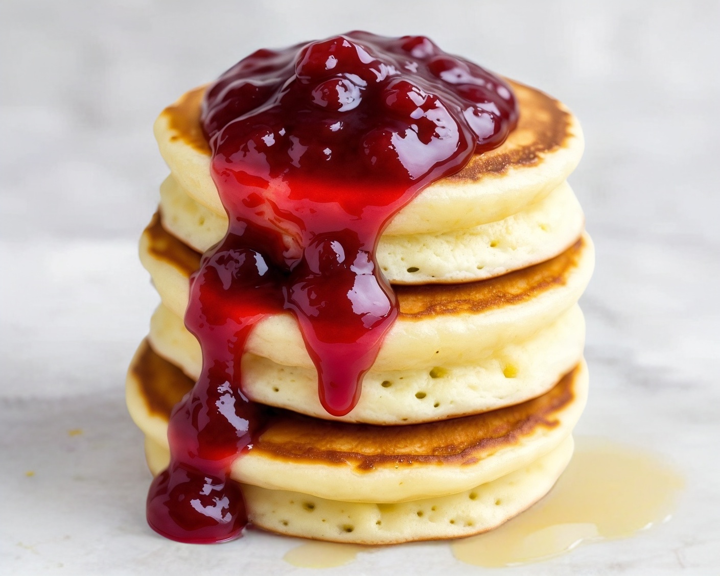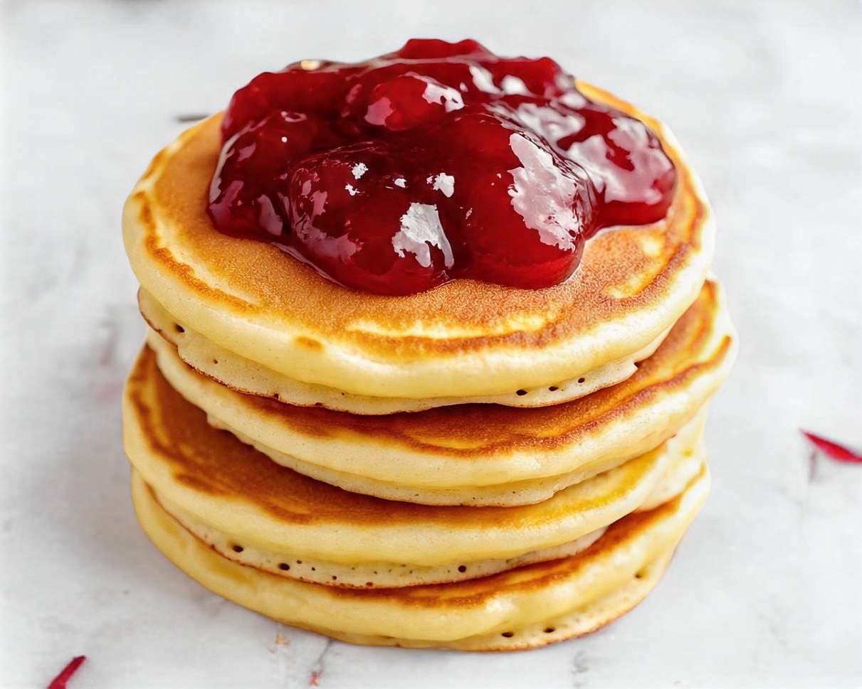 Orden de tres ricos y esponjosos HotCakes bañados en mermelada de fresa