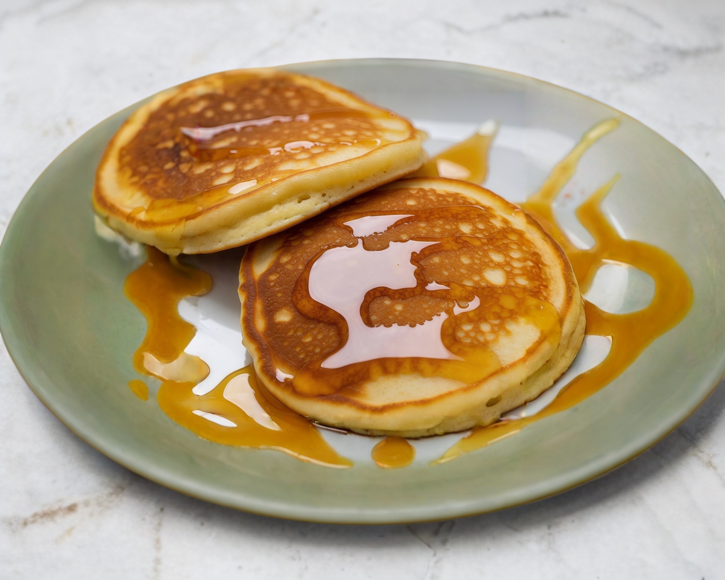 Orden de tres ricos y esponjosos HotCakes acompañados de jarabe de maple y mantequilla.