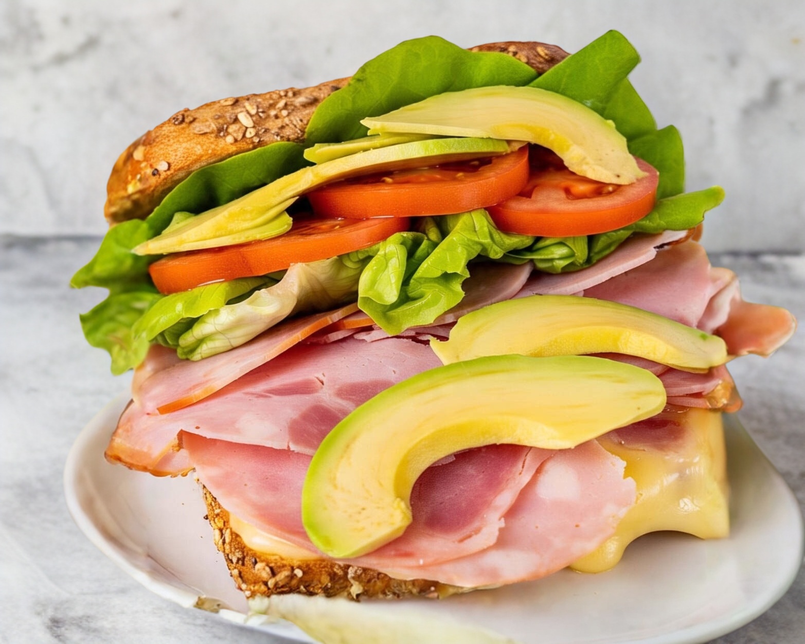 Pan blanco o integral con jamón lechuga queso panela jitomate aguacate y rajas o chipotle.