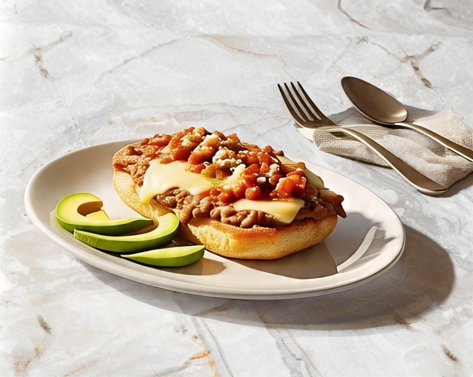 Rico bolillo tostado con frijoles queso Gouda y chorizo con pico de gallo.