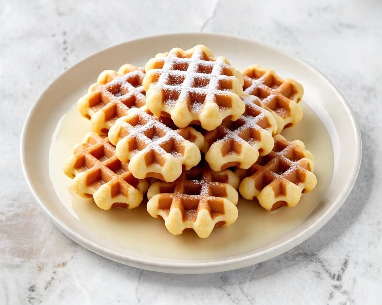 La orden consta de catorce deliciosos mini Waffles acompañados de lechera, azúcar glass y almendras fileteada.