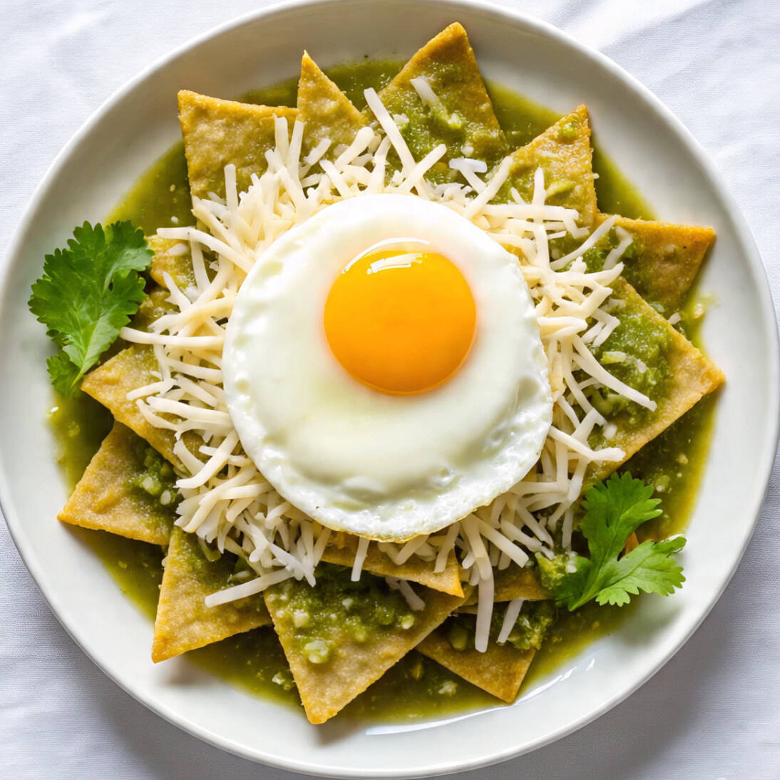 Totopo de maíz bañados en salsa verde acompañados de pollito su crema cebolla y queso