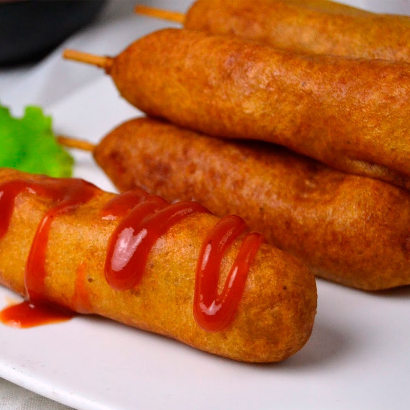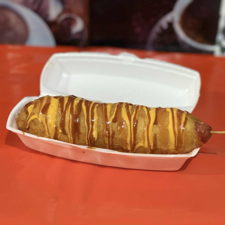 Por pieza rica banderilla de salchicha y queso Gouda acompañada de queso amarillo catsup y salsa picante