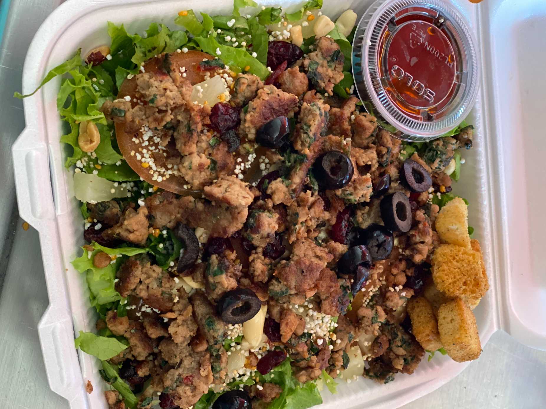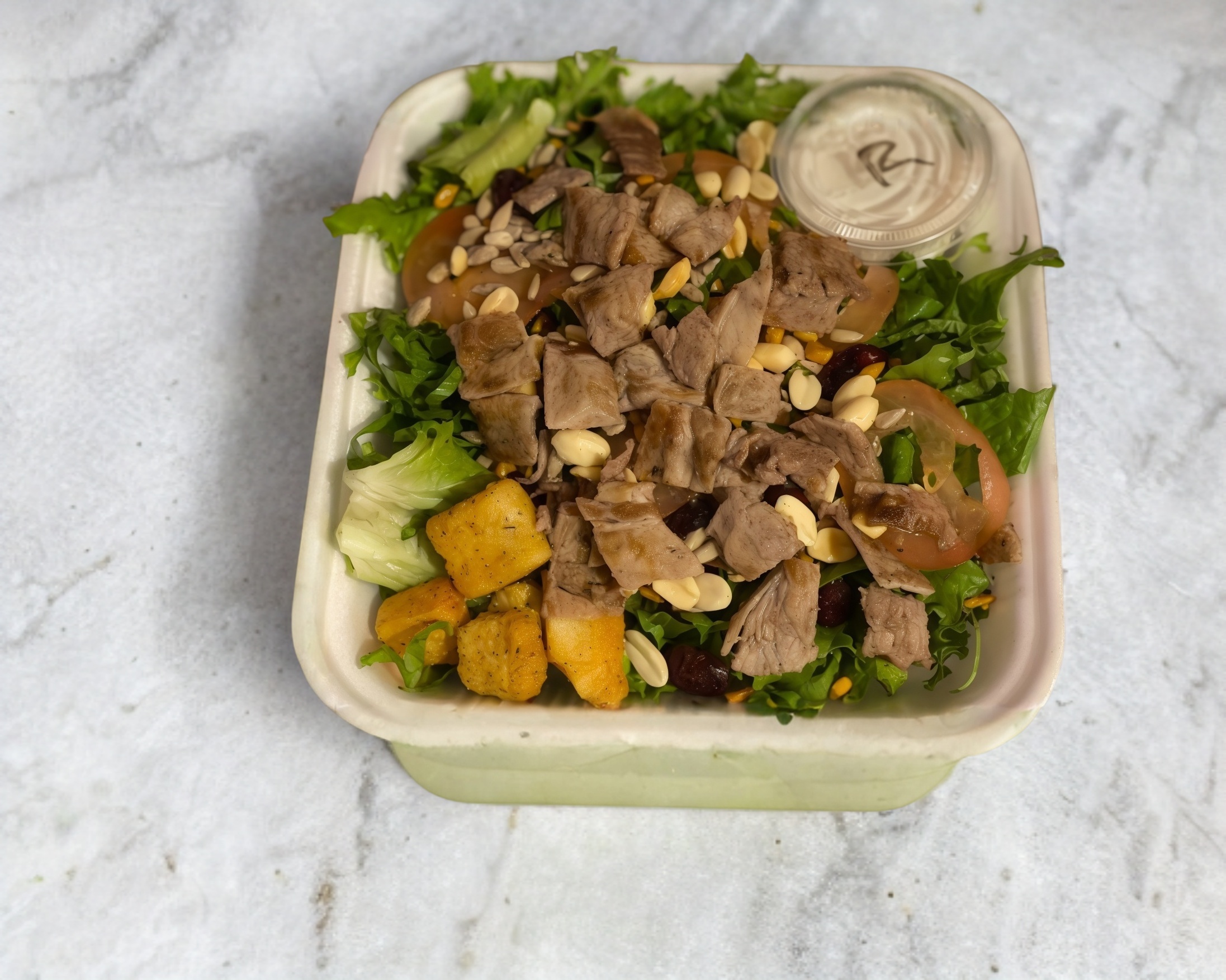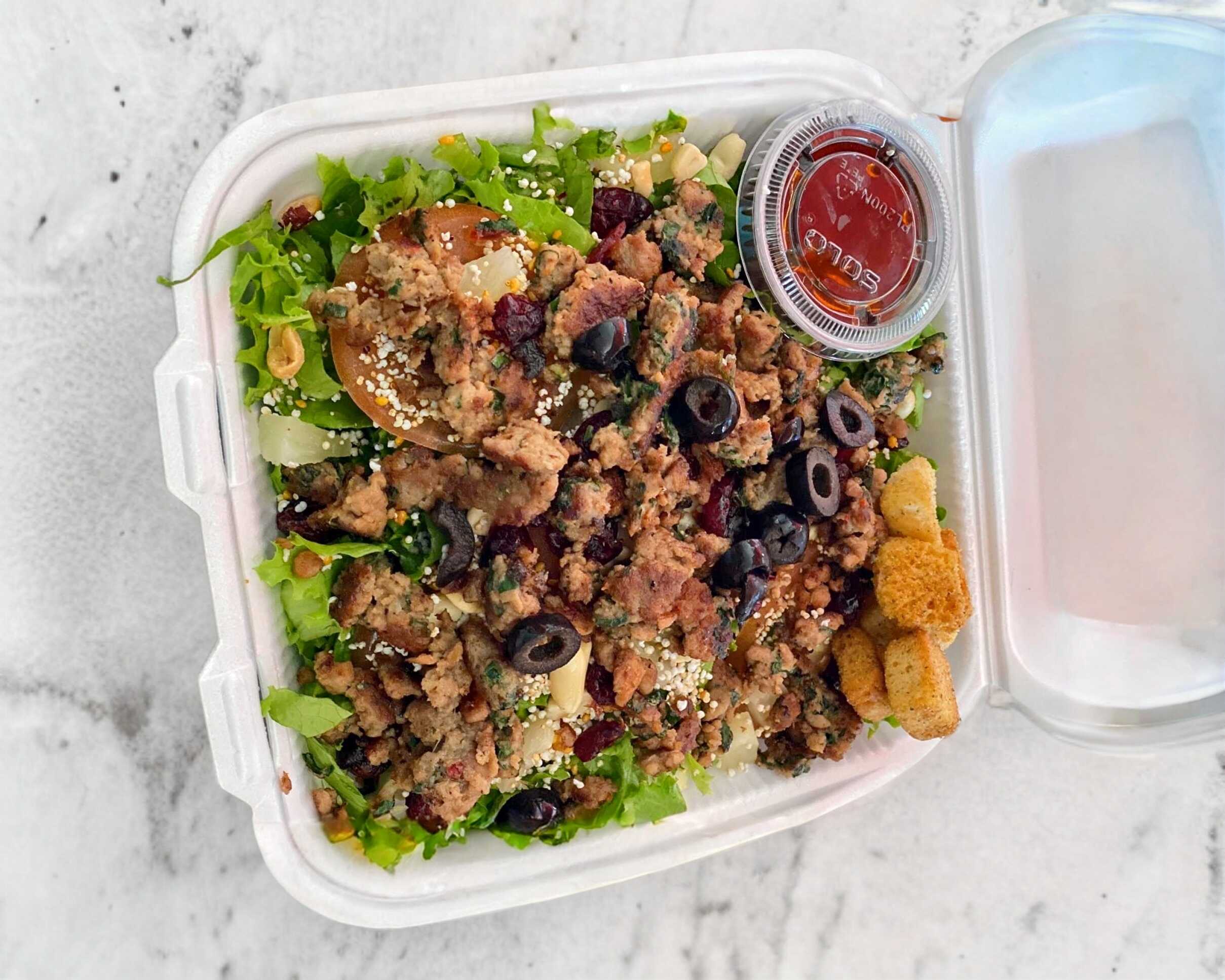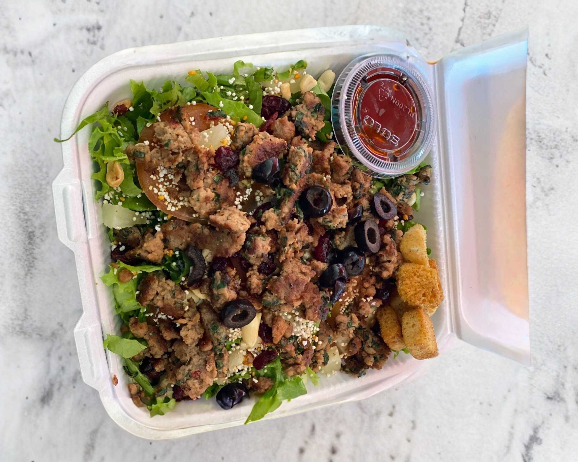 Lechuga italiana cortada, jitomate rebanado, crotones acompañado de 1 pz de pechuga de pollo empanizada en coco rayado.